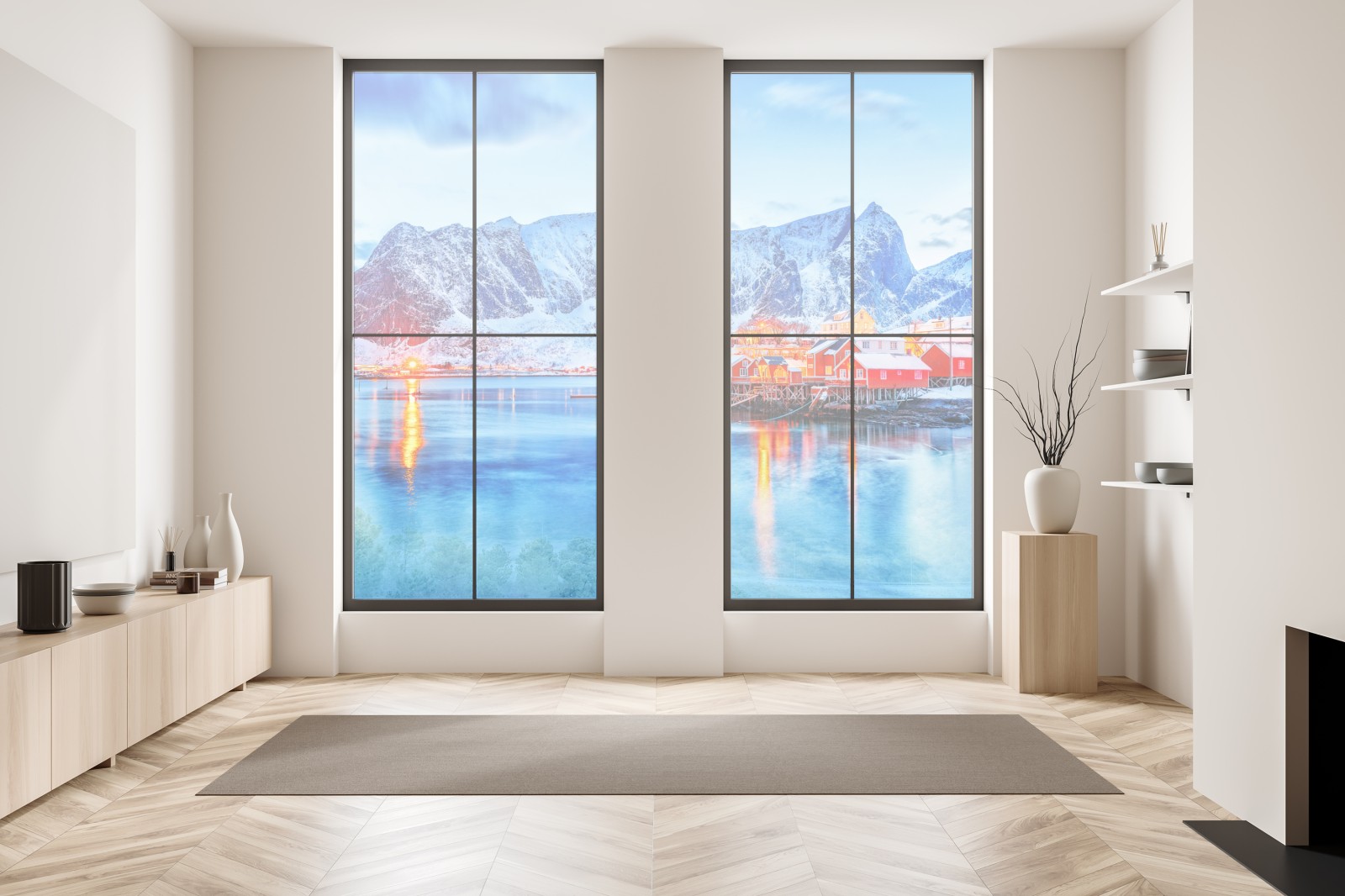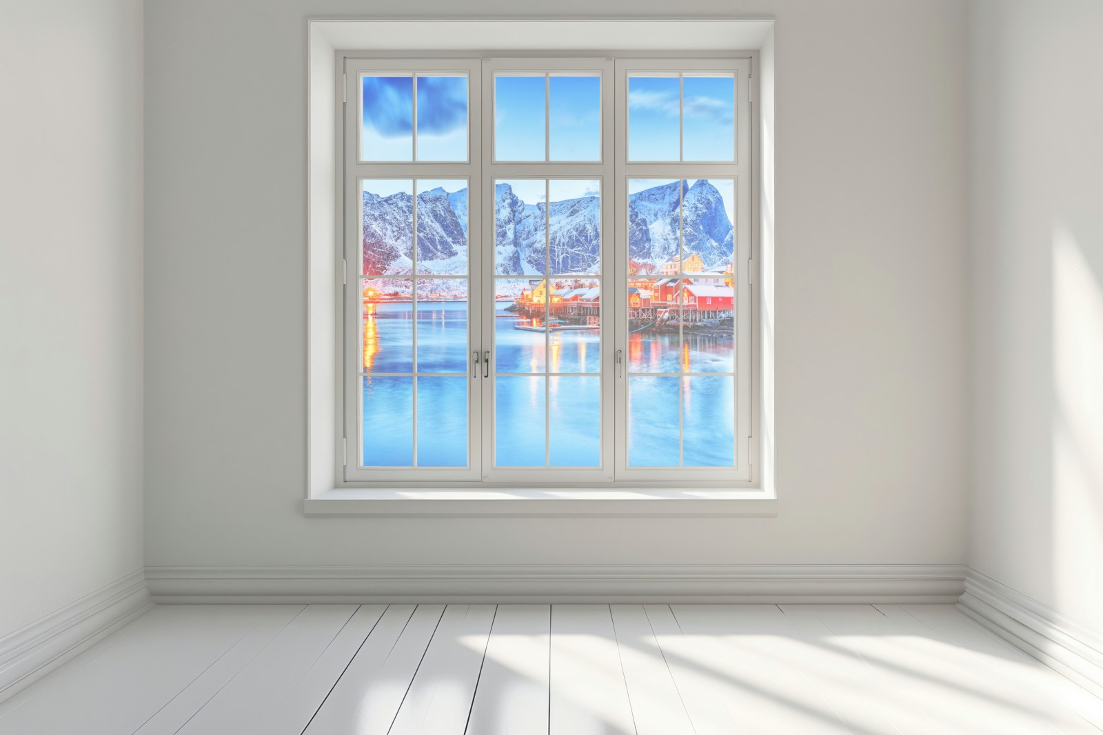 Fensteraufkleber verschneites küstendorf unter hohen bergen
