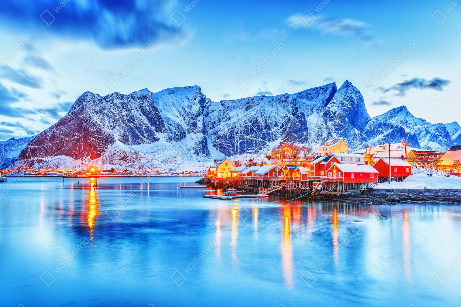 fange die ruhe eines verschneiten küstendorfs vor dramatischen bergen ein — ein eindrucksvolles motiv, das kühle, ruhige stimmung in jeden raum bringt.