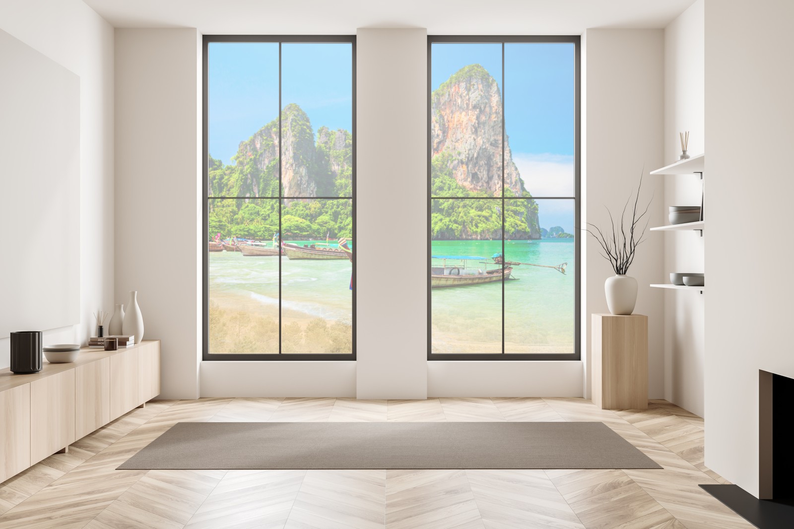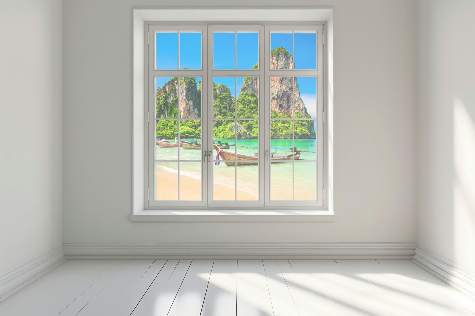 Fensteraufkleber longtail-boote an einem tropischen strand, Thailand