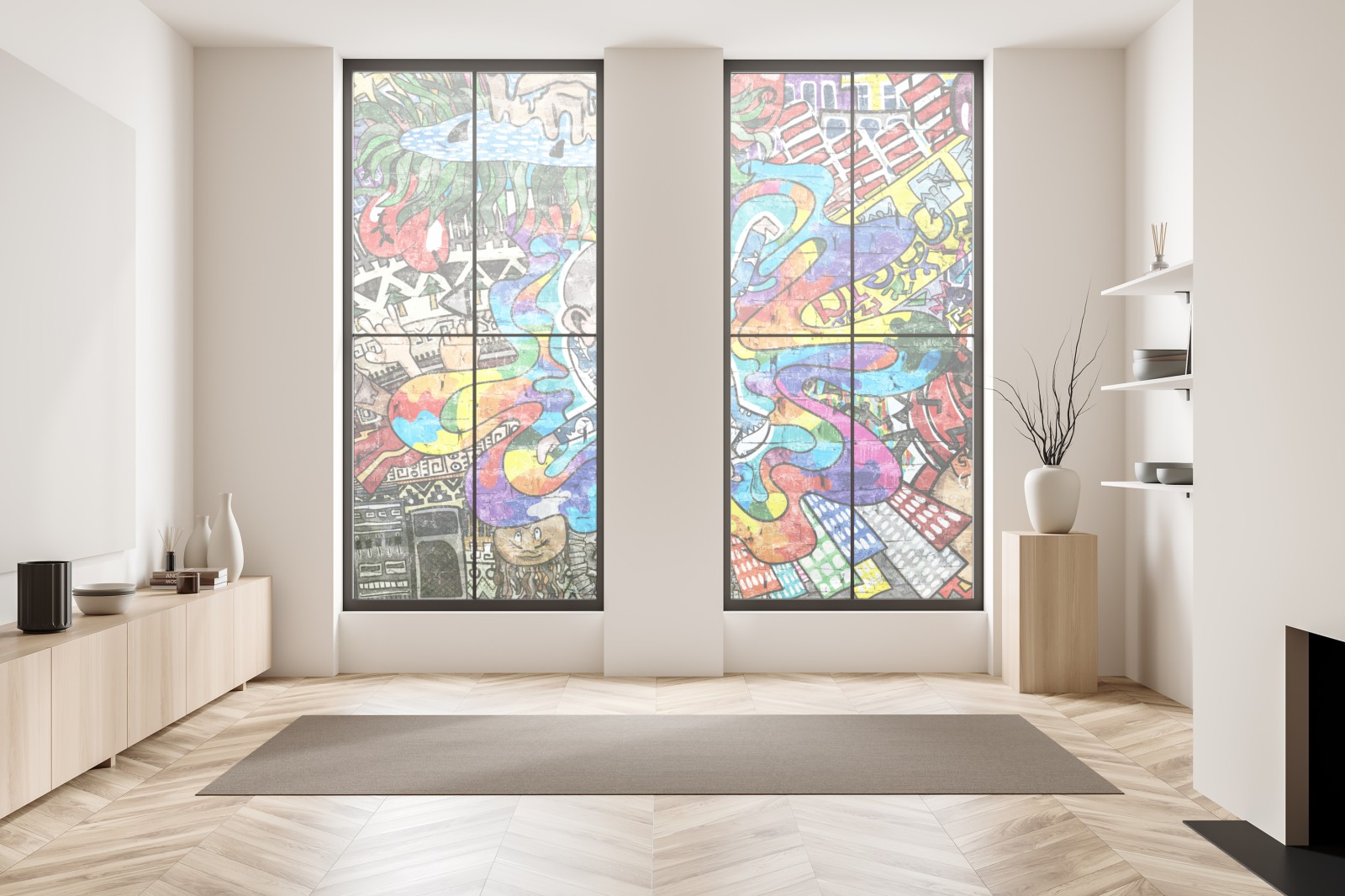 Lebendiges Street-Art-Mural voller Farben und verspielter Figuren, perfekt um urbanen Schwung und charakterstarke Akzente in Innenräumen zu setzen.