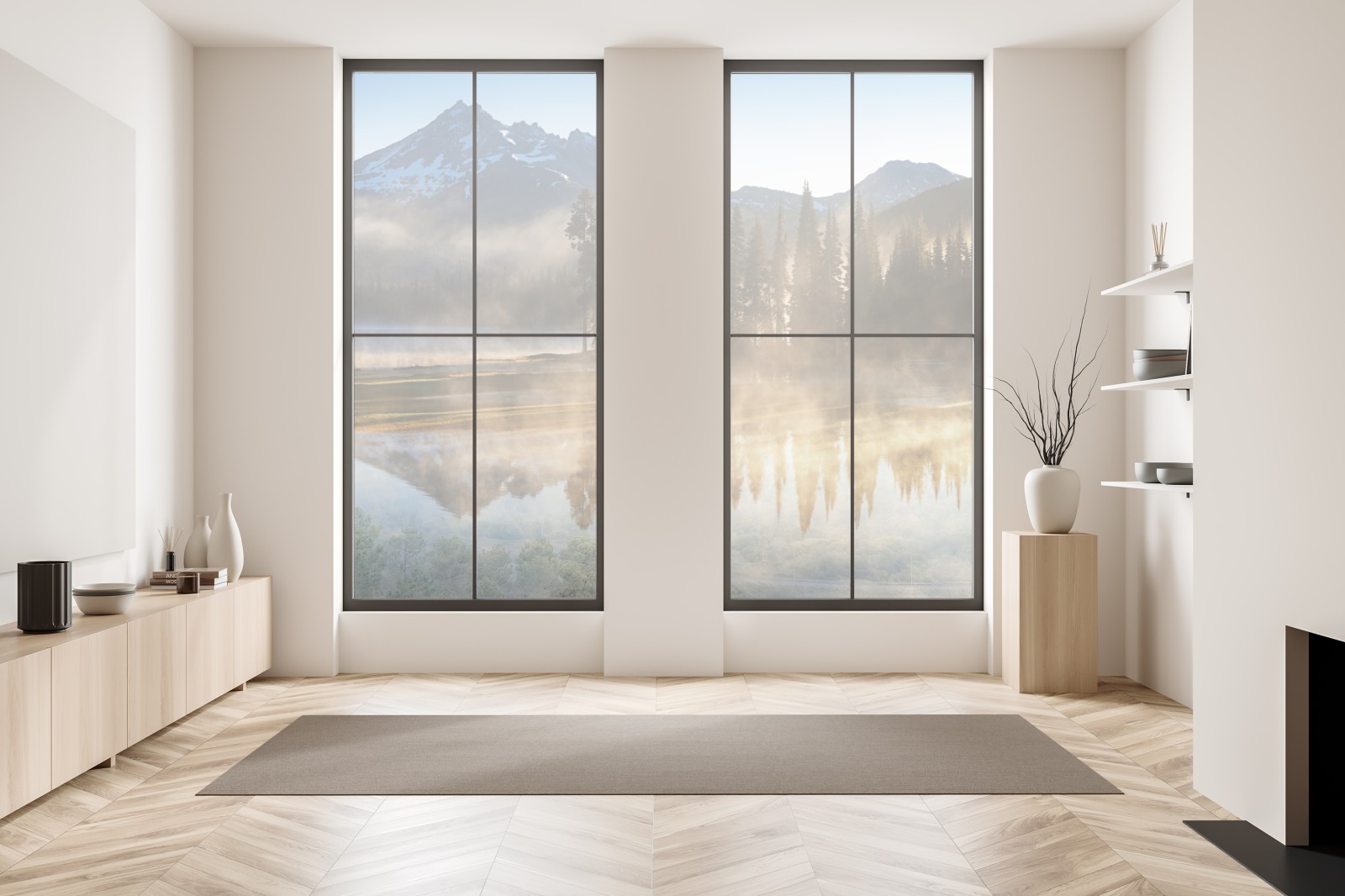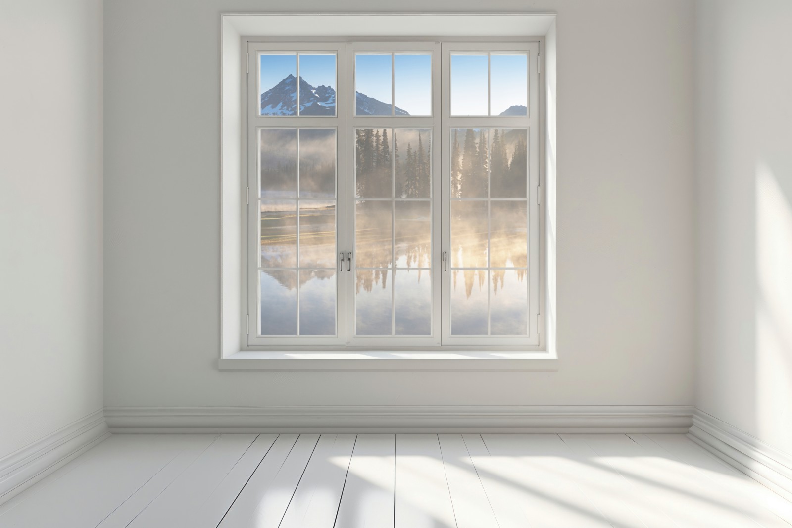 Ein ruhiger Bergsee bei Sonnenaufgang mit nebelverhangenen Kiefern und klarer Spiegelung, der jedem Raum natürliche Ruhe und Schönheit verleiht.