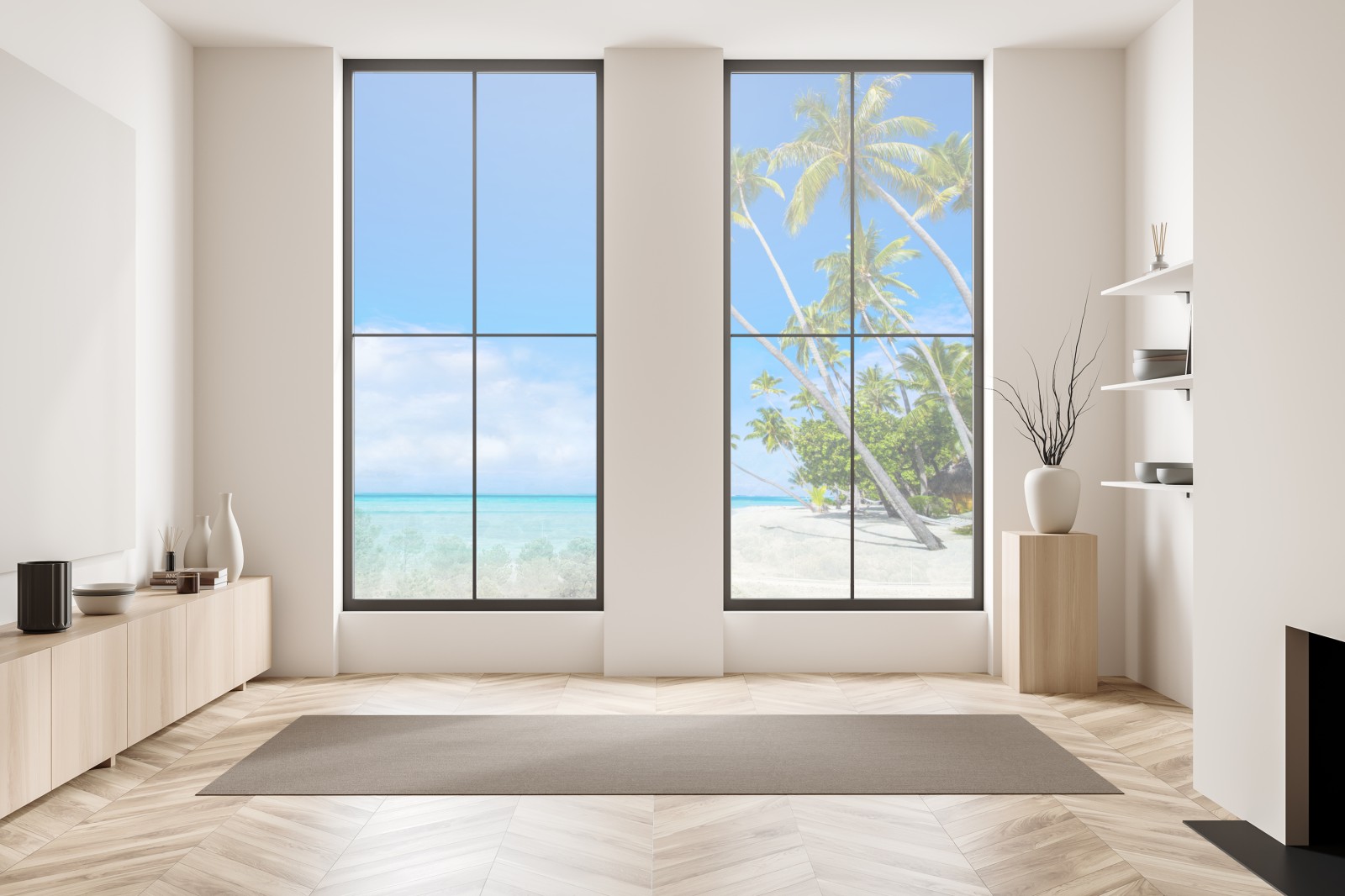 Bringen Sie die beruhigende Atmosphäre eines tropischen Strandes in Ihr Zuhause mit türkisfarbenem Wasser, wiegenden Palmen und makellosem weißem Sand.