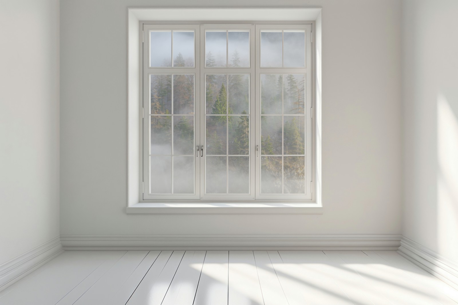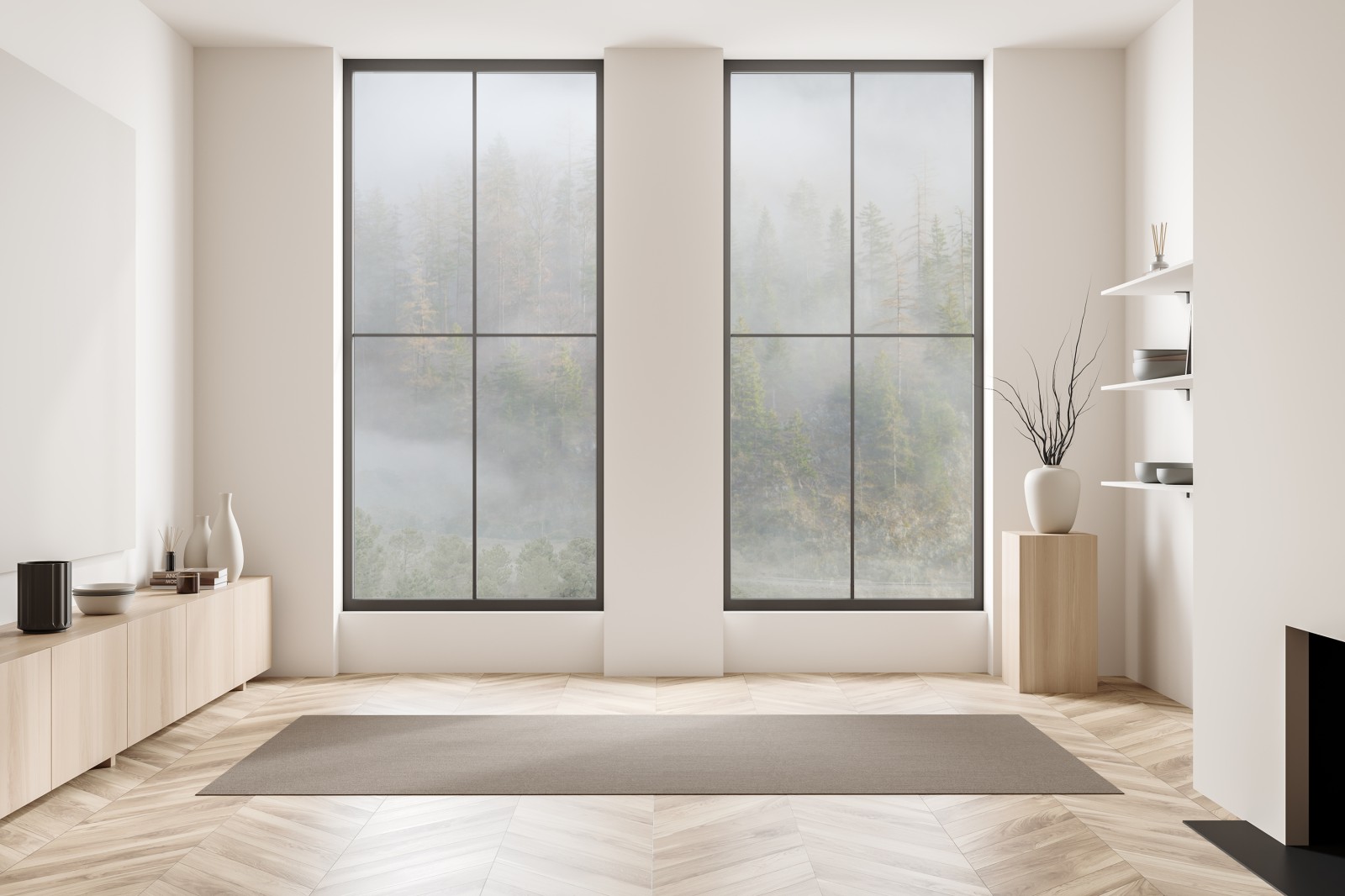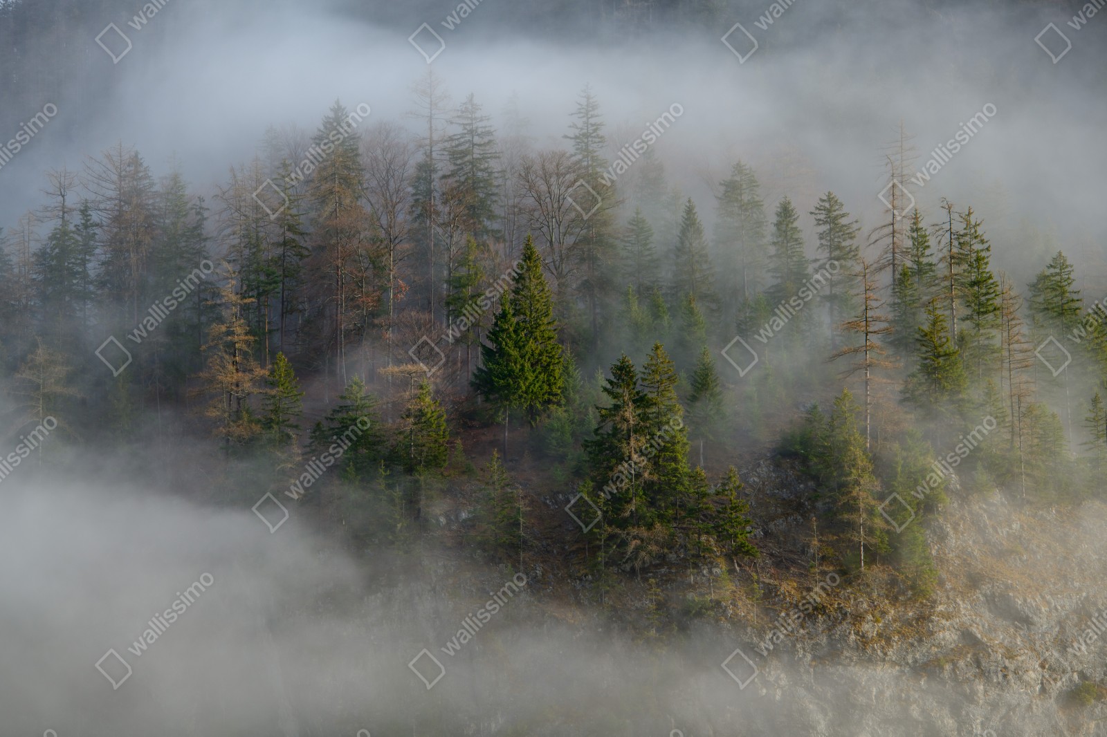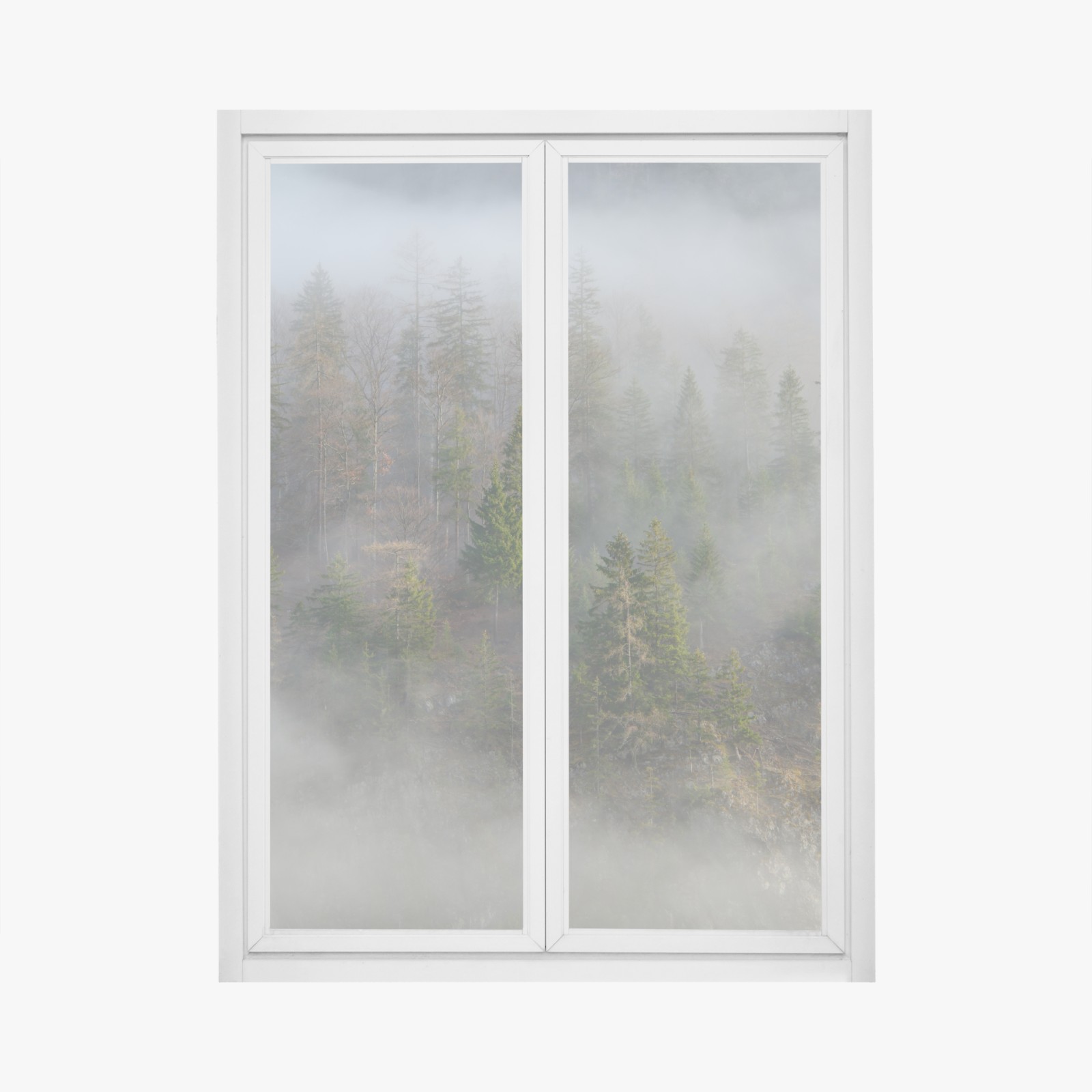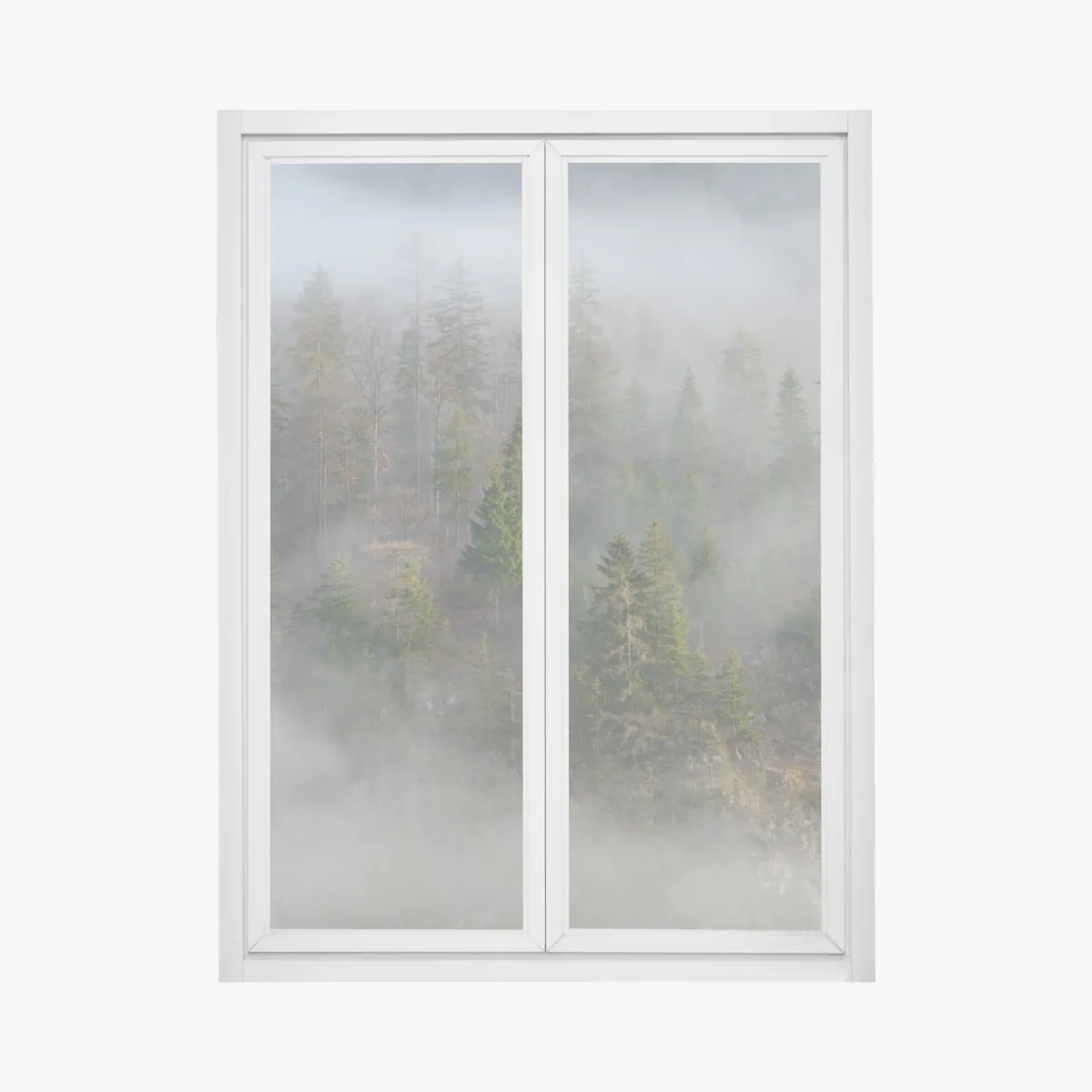 Nebliger Bergwald, der Ruhe und natürliche Atmosphäre in jeden Raum bringt.