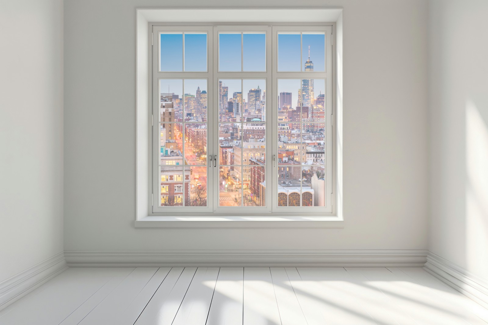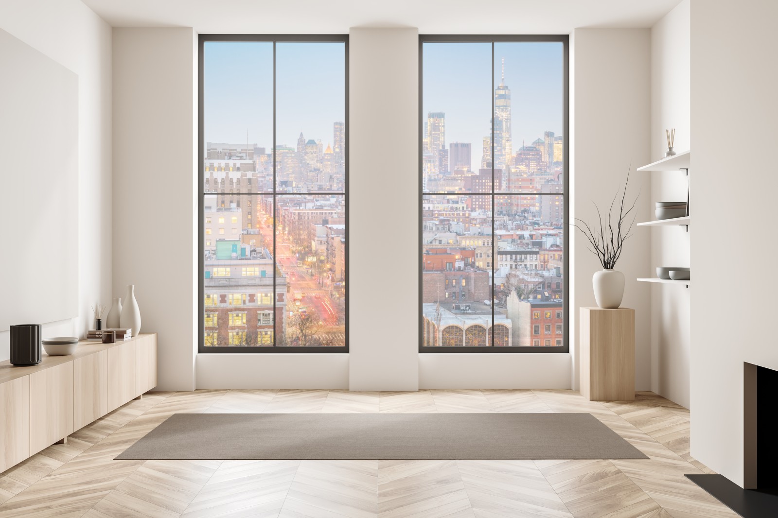 Atemberaubender Blick auf die Skyline von New York bei Dämmerung mit funkelnden Stadtlichtern, ideal zur Verschönerung moderner Räume.