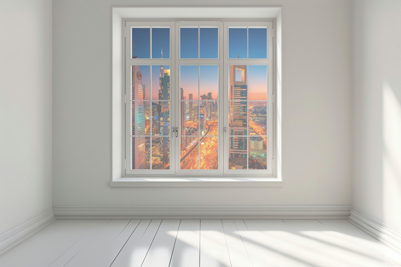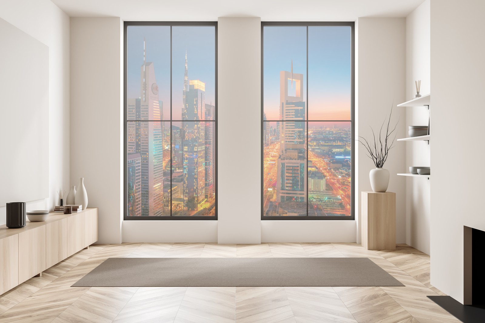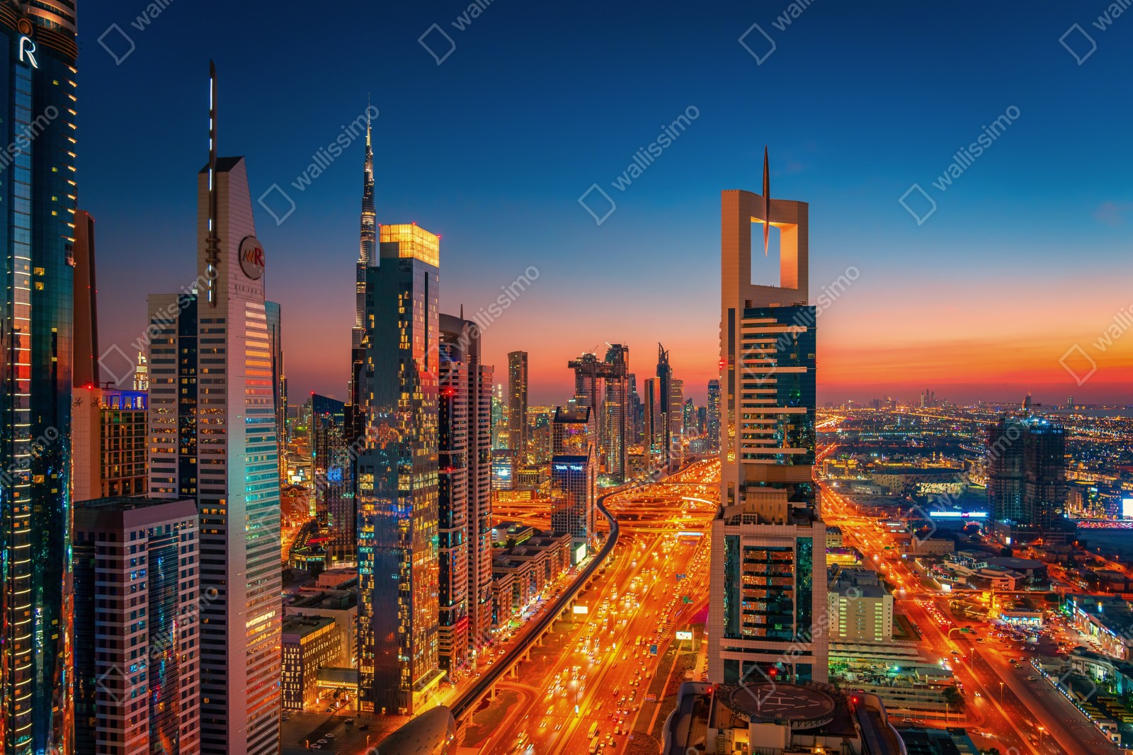 beeindruckende Dubai skyline bei dämmerung mit leuchtenden gebäuden und belebten straßen, perfekt für moderne wohnräume.