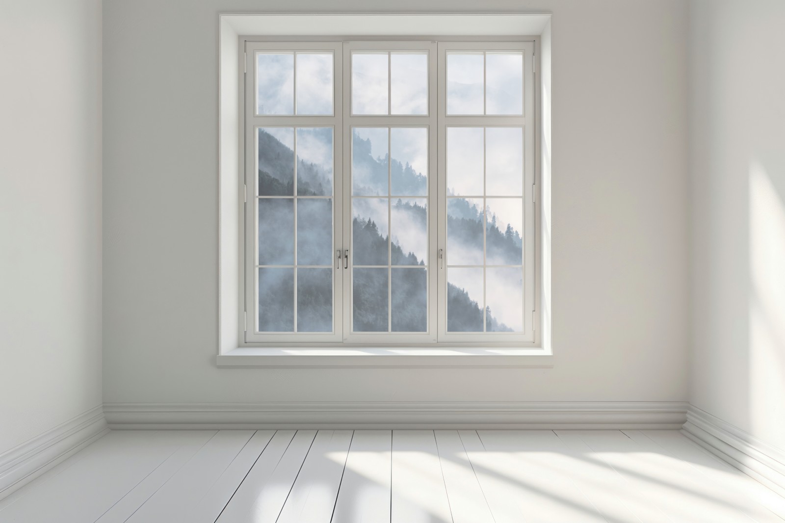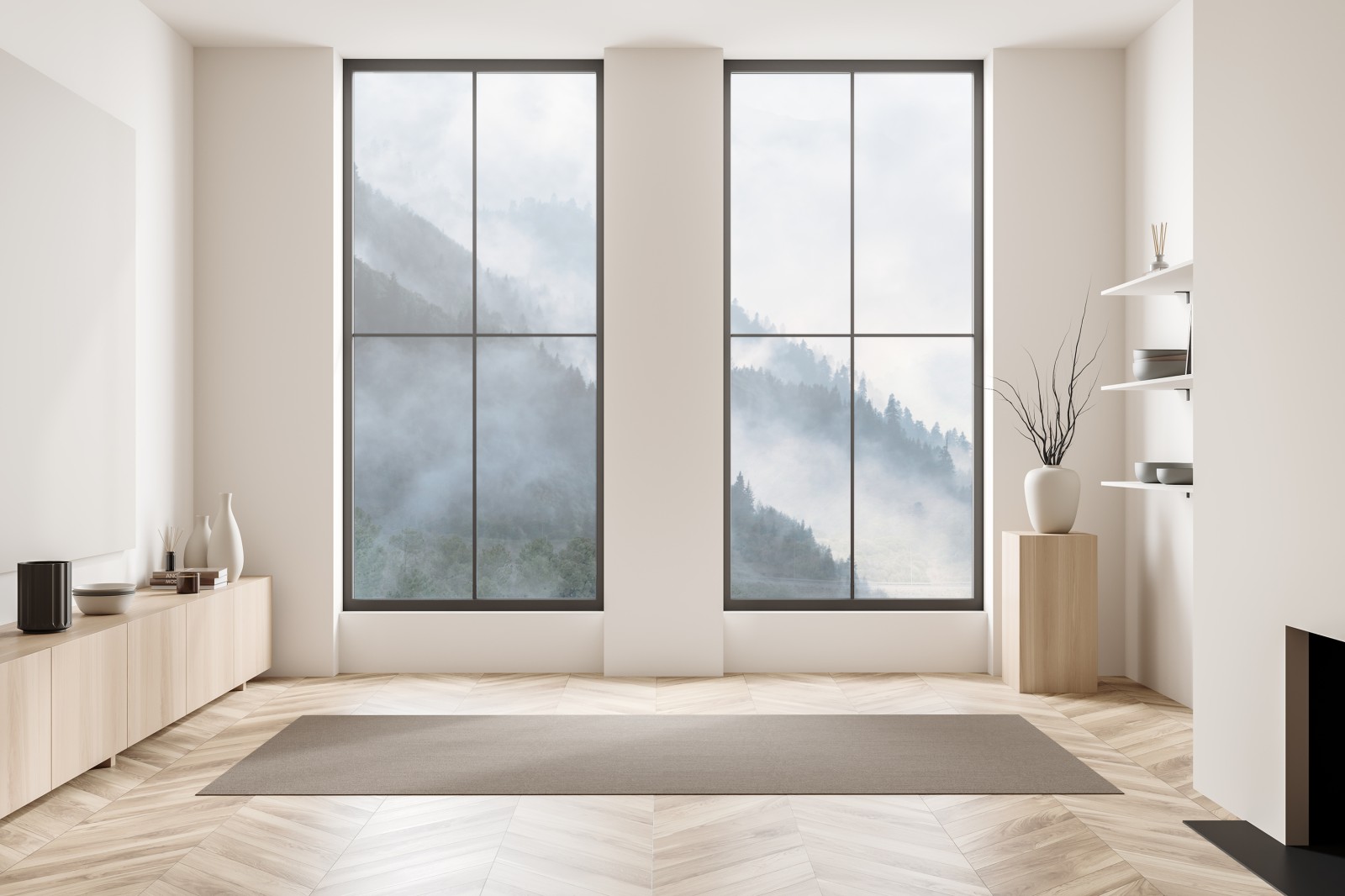 Eine ruhige neblige Berglandschaft, die jedem Raum eine naturverbundene und entspannende Atmosphäre verleiht.