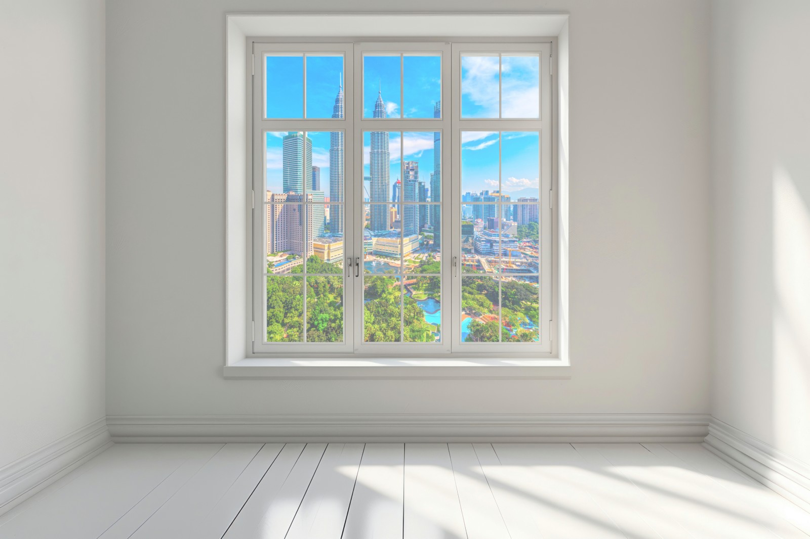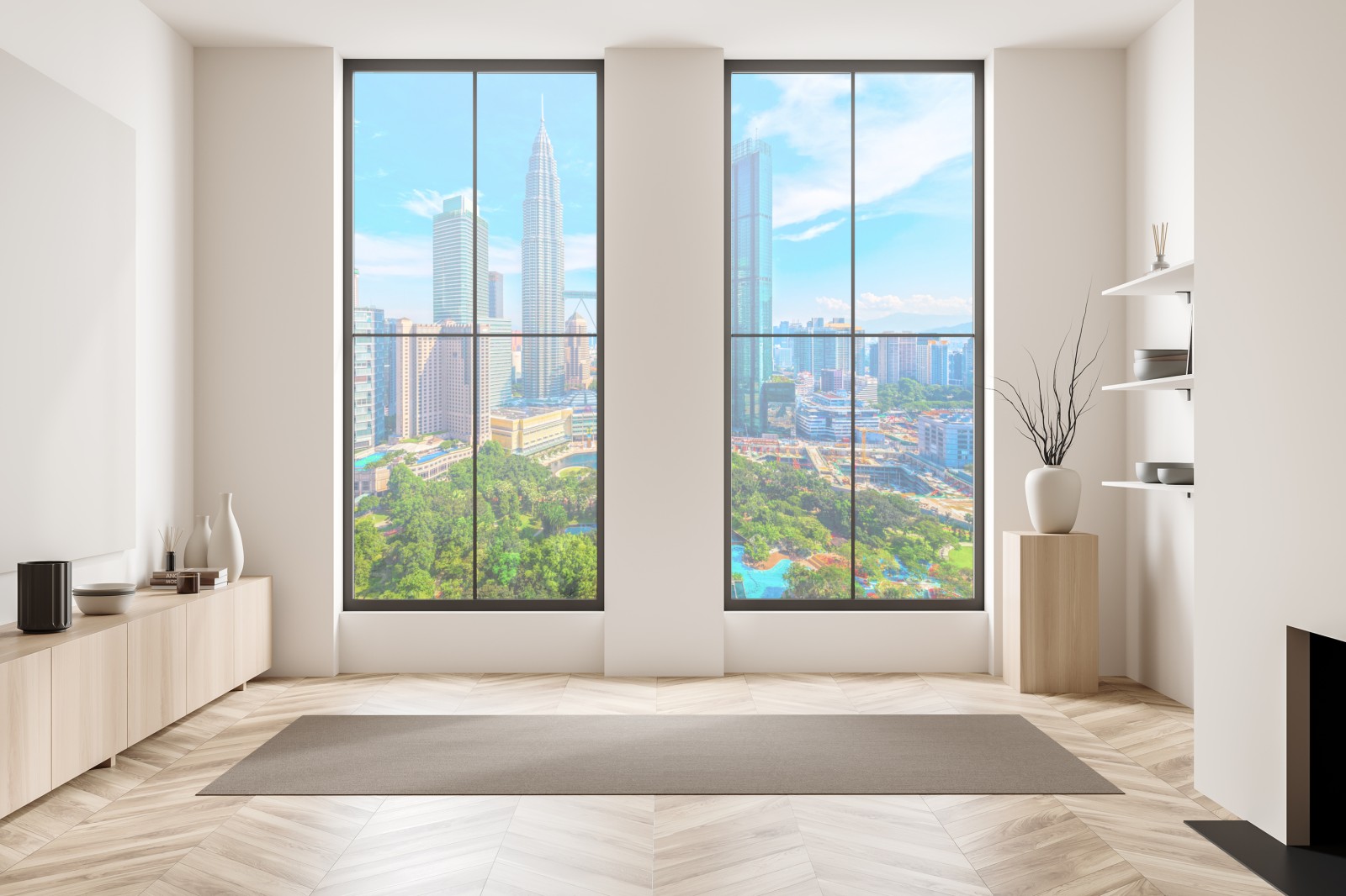 Lebendige Ansicht der Skyline von Kuala Lumpur mit den ikonischen Petronas Towers, grünen Parks und modernen Wolkenkratzern, perfekt als Wanddekoration.