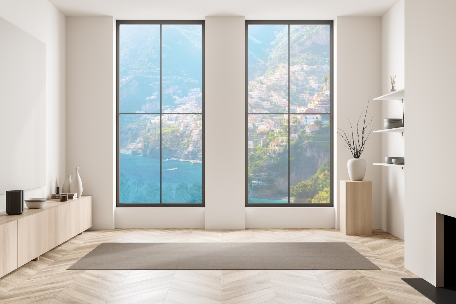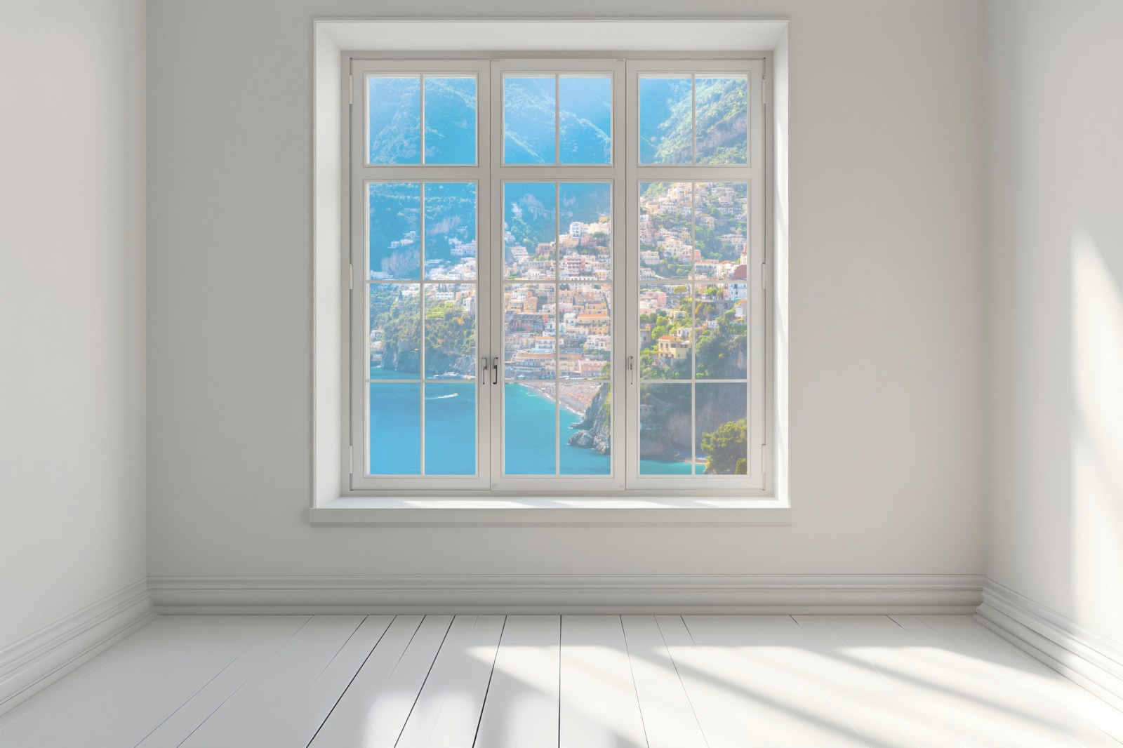 Lebhafte Küstenaufnahme von Positano mit pastellfarbenen Häusern, türkisfarbenem Meer und dramatischen Klippen, die mediterranes Flair in Ihr Zuhause bringt.