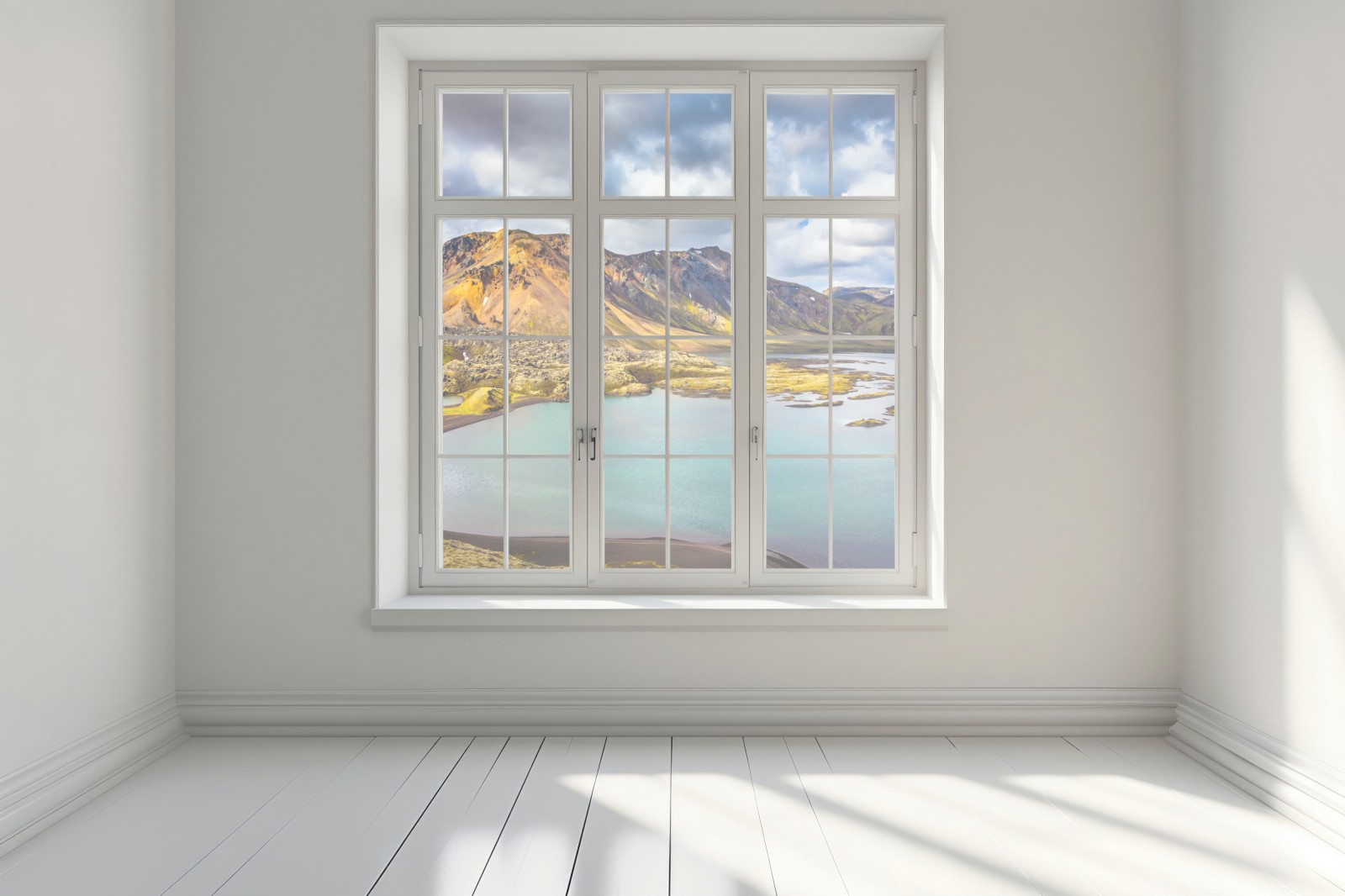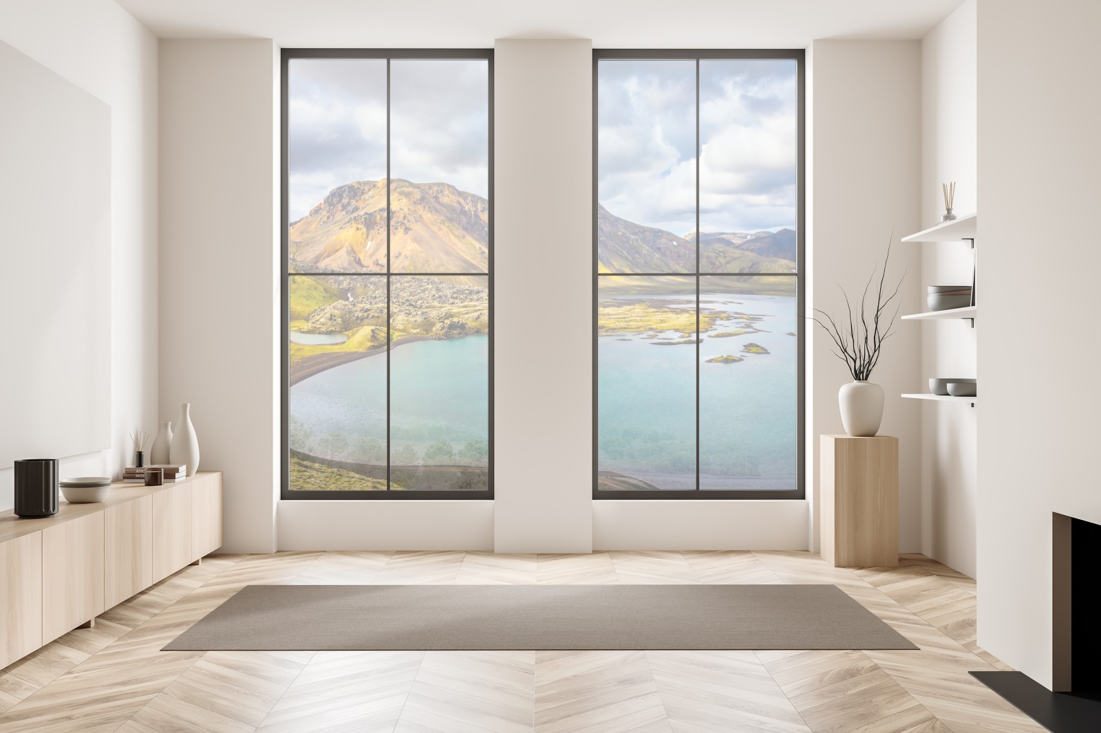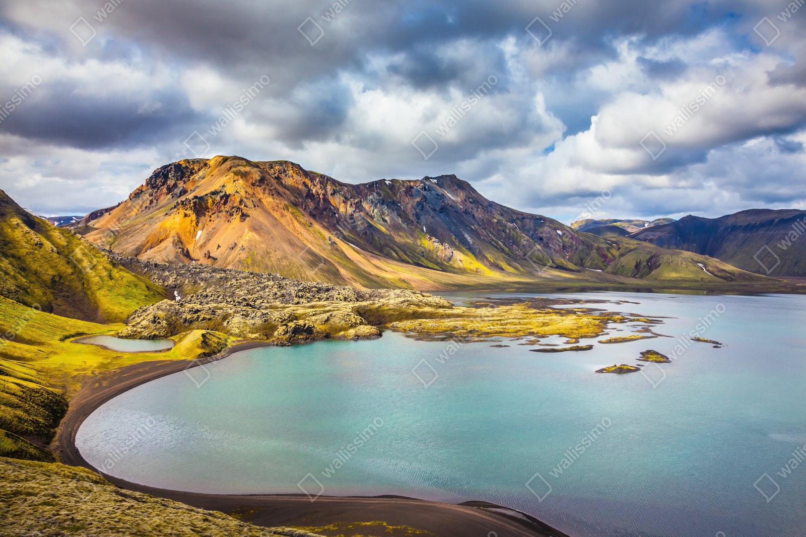 Ruhige Sommerszene mit türkisfarbenem See und bunten Bergen auf Island, ideal um natürliche Ruhe in Ihr Zuhause zu bringen.