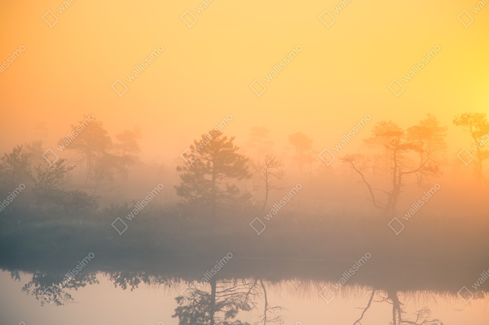 Ein träumerischer nebelverhangener Moormorgen im goldenen Licht, ideal für ruhige, naturnahe Wohnräume.