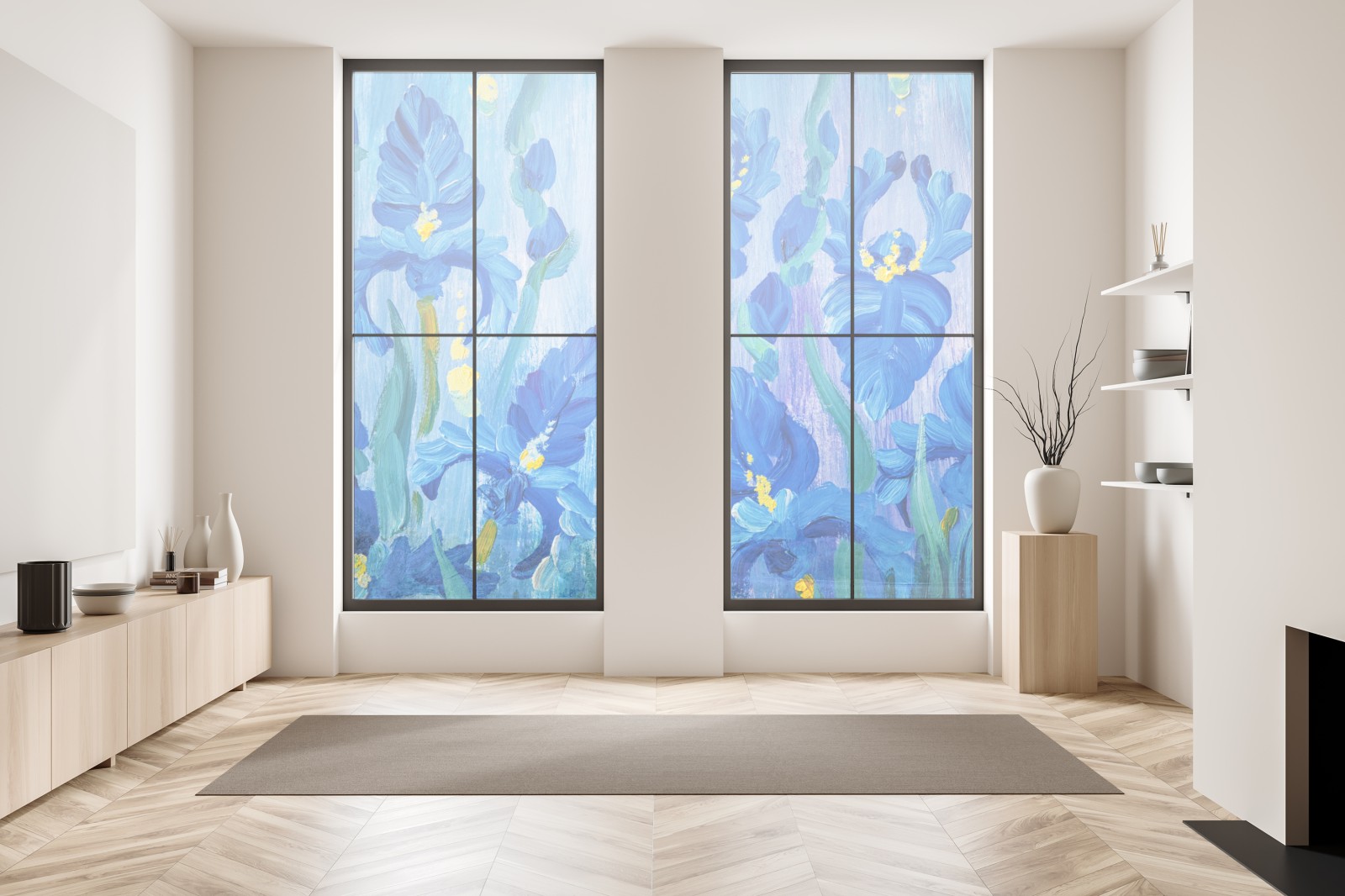 Ein eindrucksvolles Ölgemälde mit kräftigen blauen Irisblüten, das jedem Raum lebendige Farbe und botanische Eleganz verleiht.