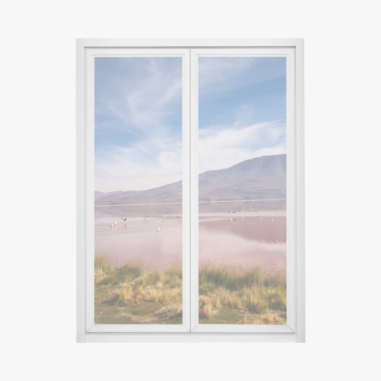 Fensteraufkleber Rosa lagune mit flamingos und bergspiegelung