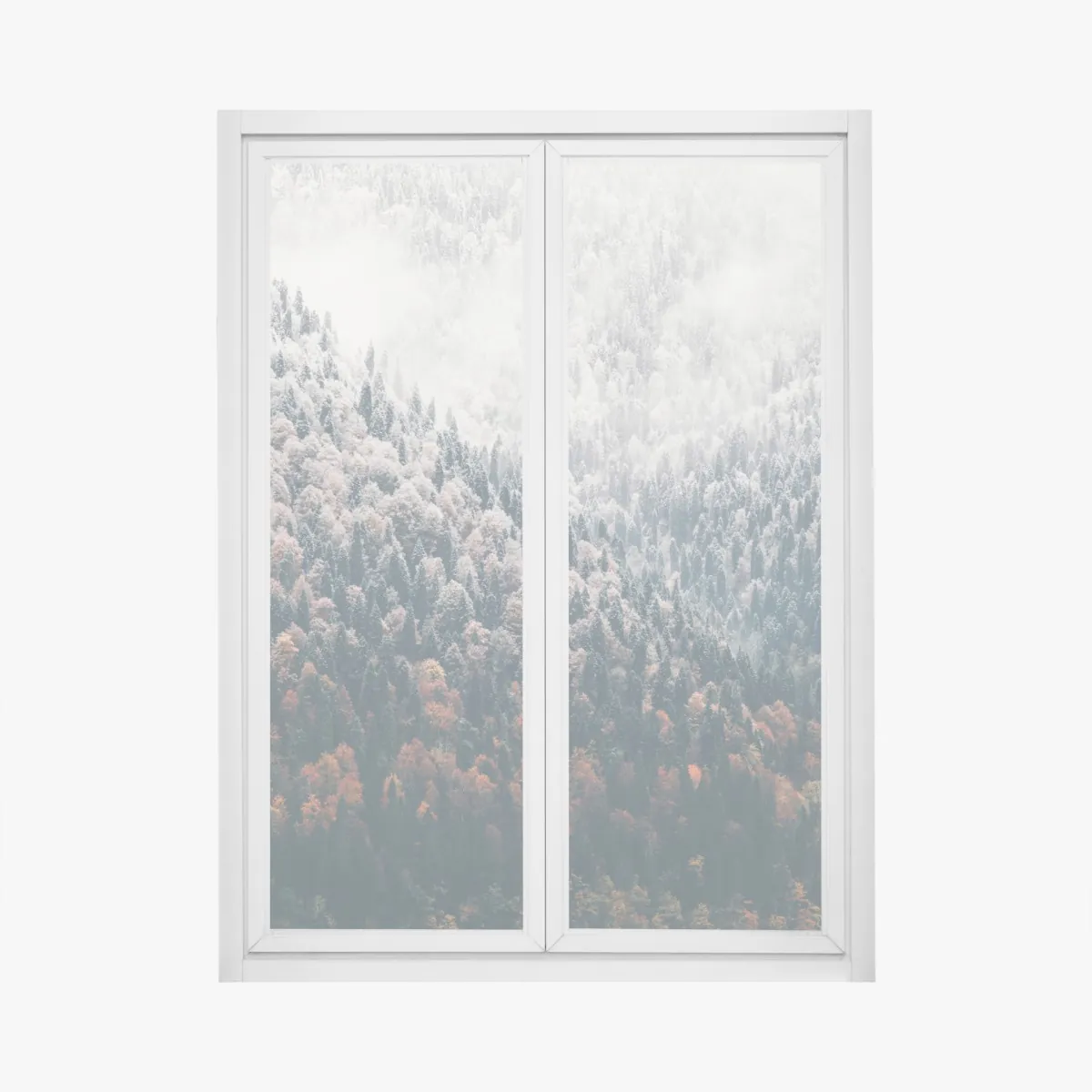 Fensteraufkleber nebliger herbstwald am schneebedeckten berg