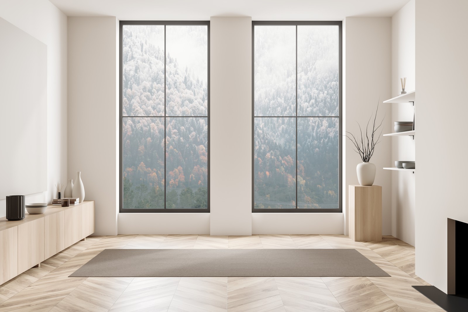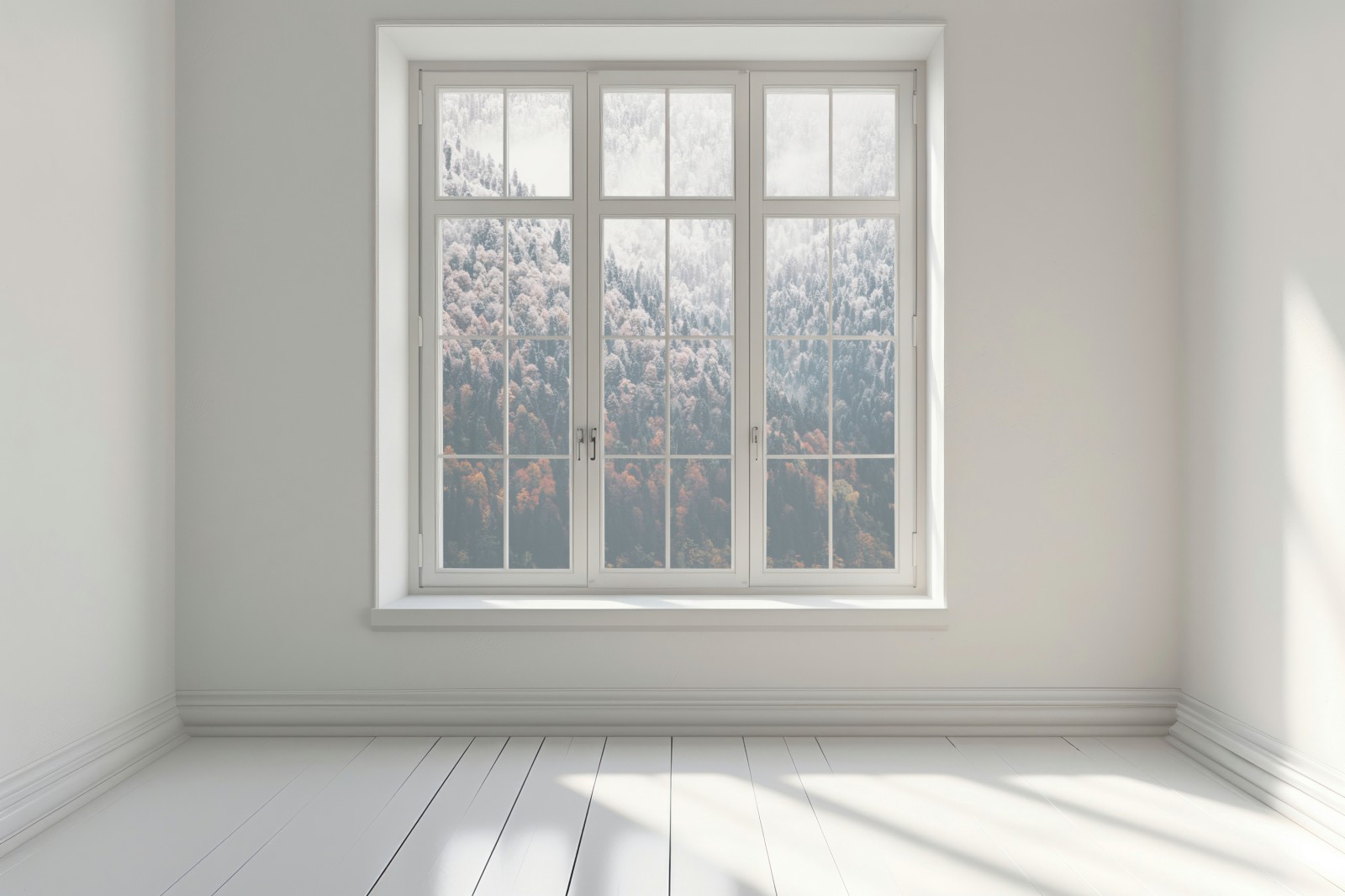Eine ruhige Bergwaldszene, die herbstliche Farben mit frischem Schnee und Nebel verbindet und Ihrem Raum natürliche Gelassenheit verleiht.