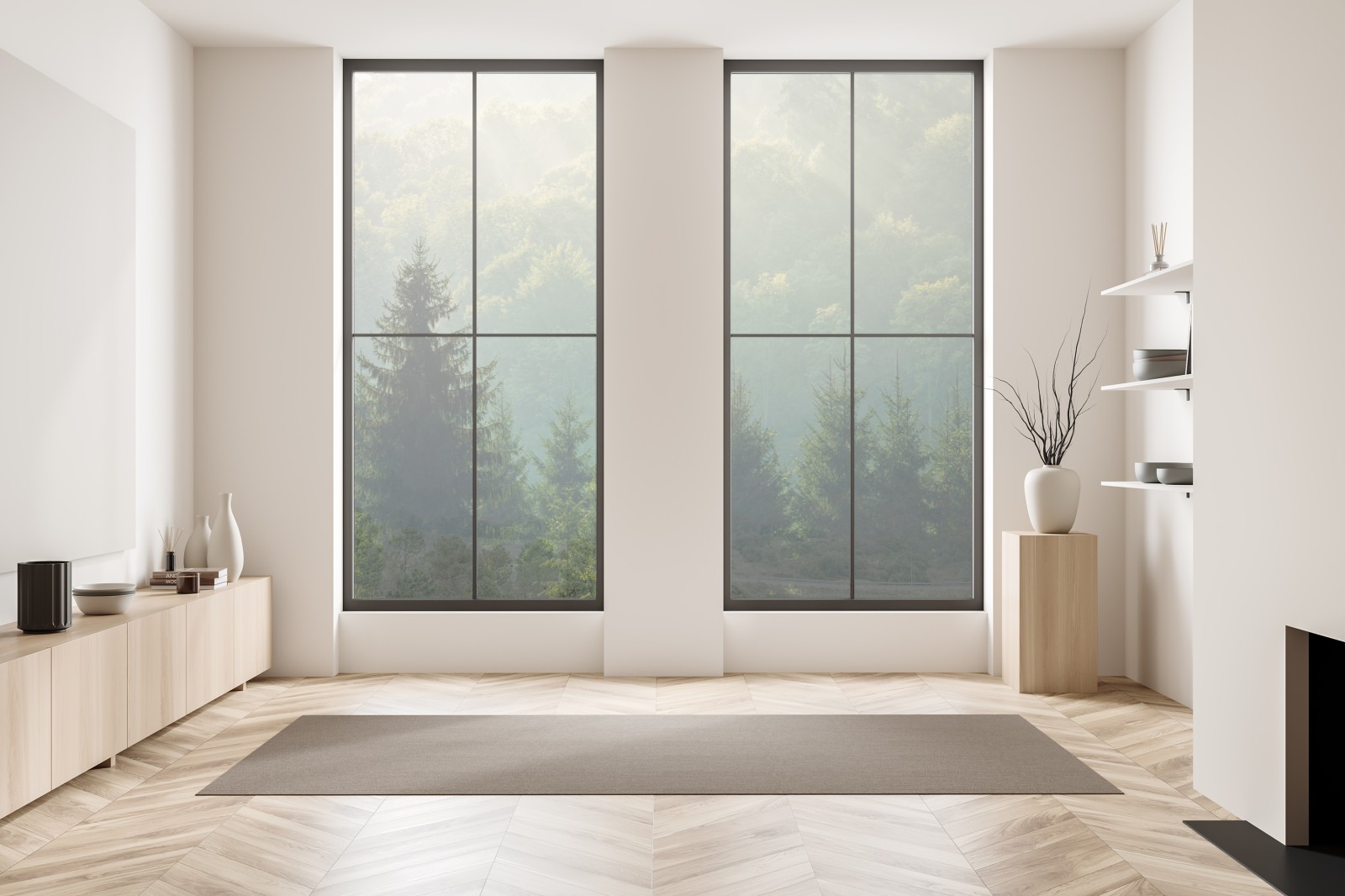 Ein ruhiger Blick auf Fichten und goldene Morgenstrahlen im nebligen Karpatenwald, ideal, um natürliche Atmosphäre in Ihr Zuhause zu bringen.
