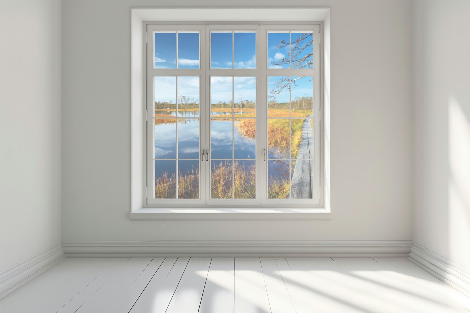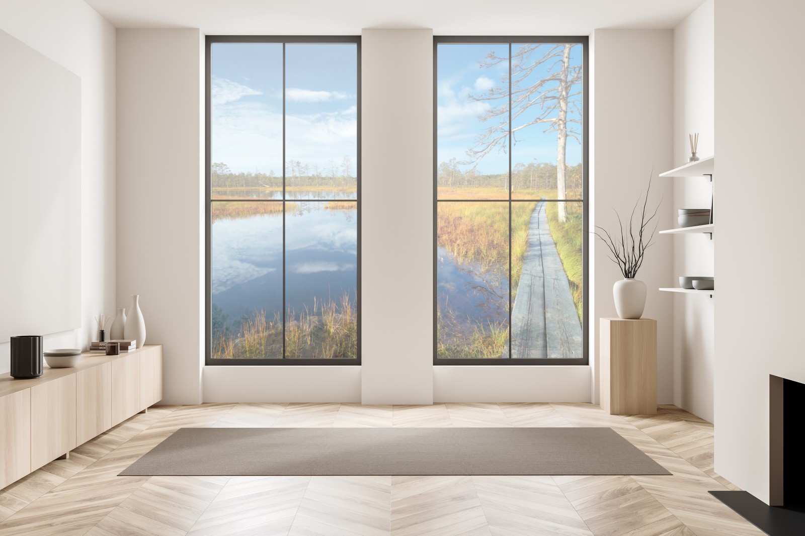 Ein ruhiges landschaftsbild mit einem hölzernen Steg über einem spiegelnden Moor und klarem blauem Himmel, ideal um Natur und Ruhe ins Zuhause zu bringen.