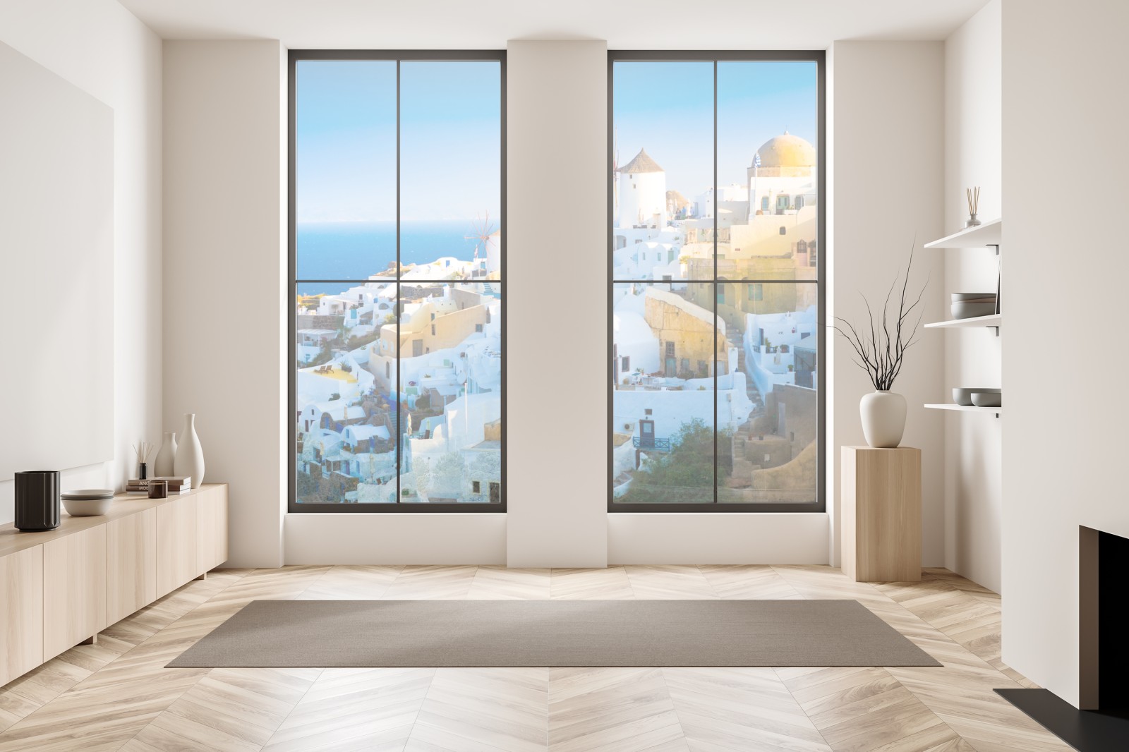 Heller mediterraner Blick auf Santorinis weißgetünchte Häuser und Windmühlen mit Blick auf das tiefblaue Meer, perfekt um maritimen Charme in jeden Raum zu bringen.