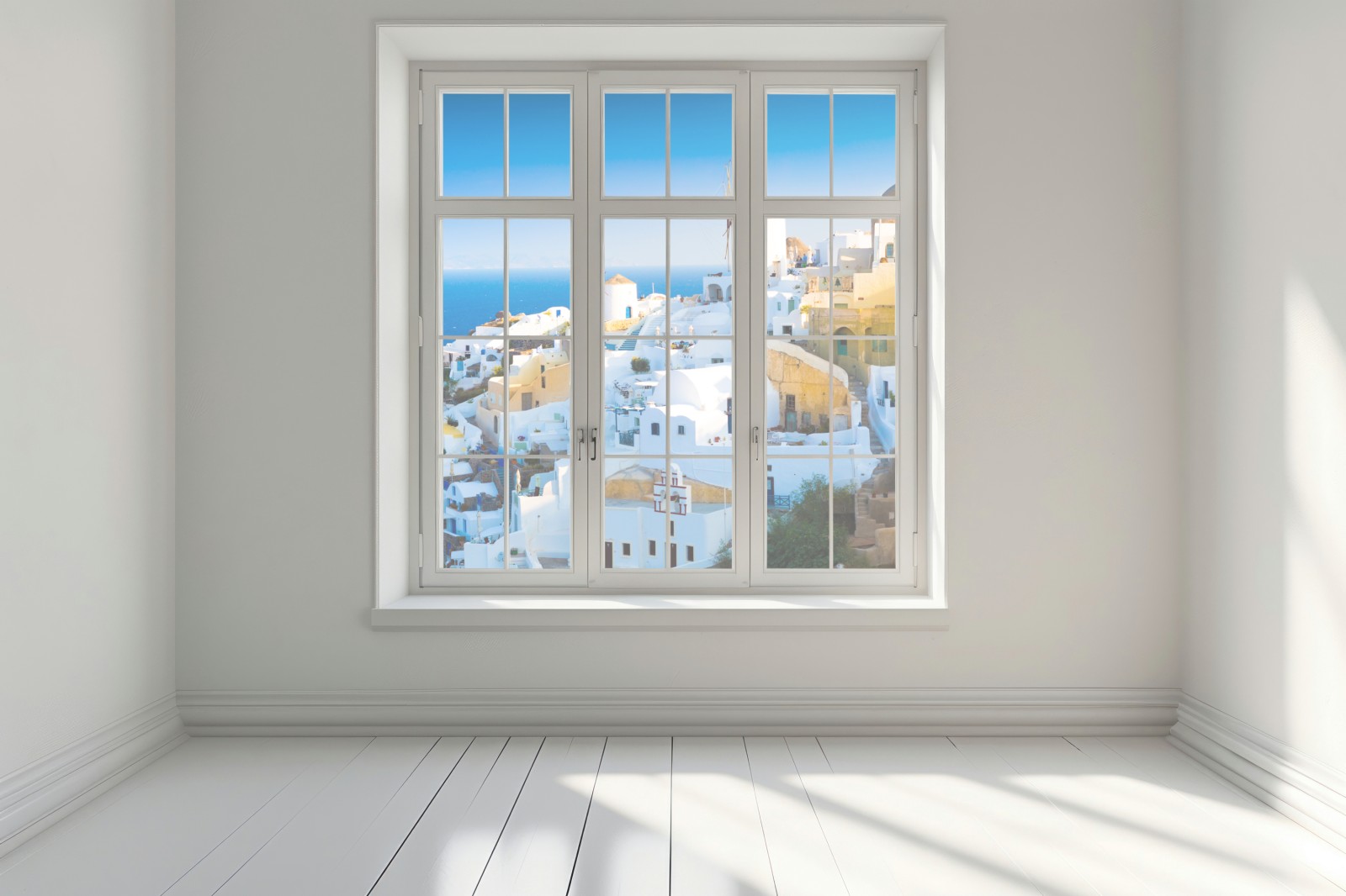 Fensteraufkleber sonnenbeschienenes Santorini-dorf am meer