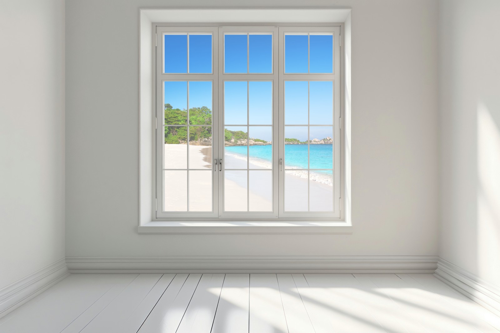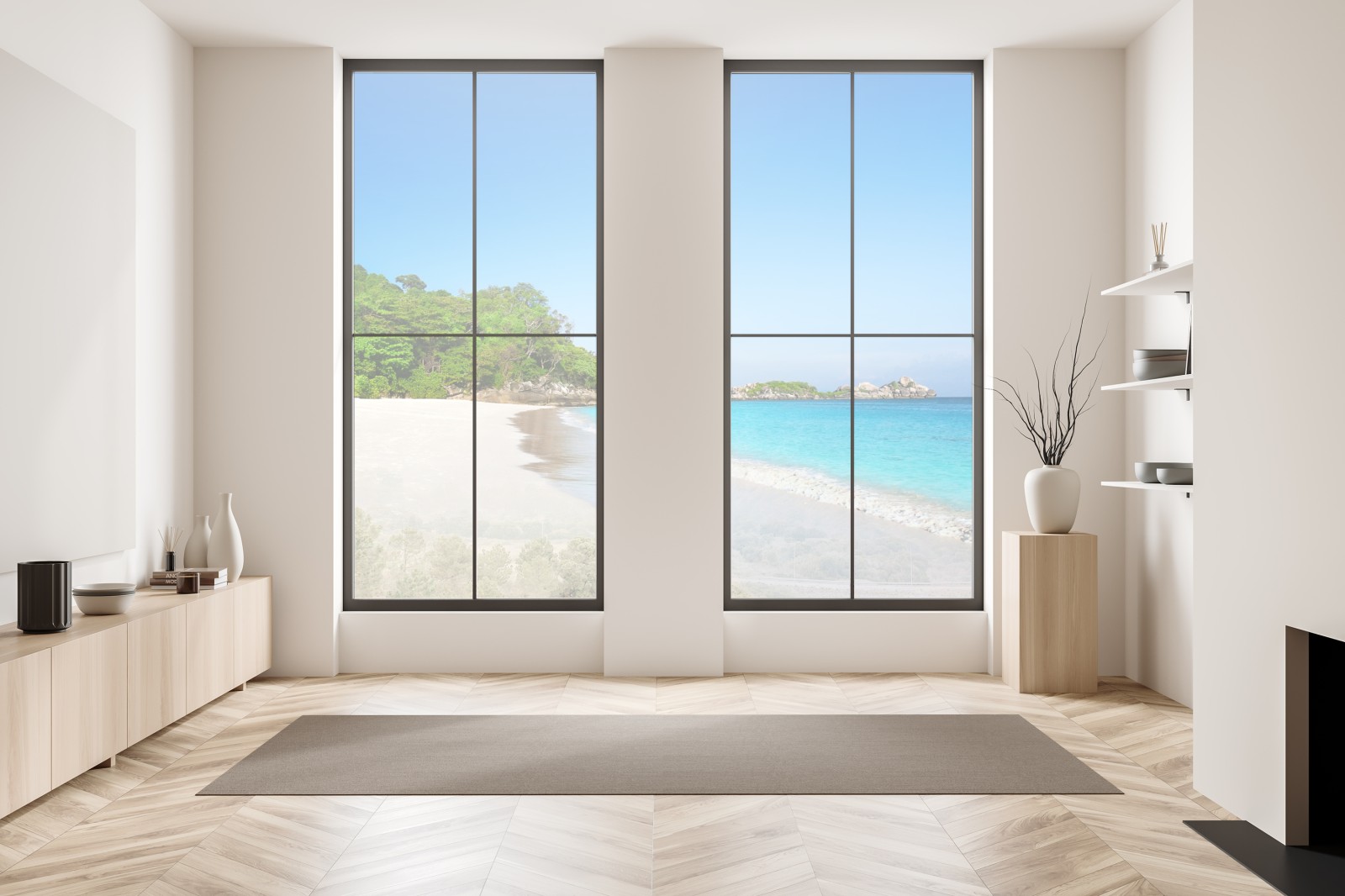Bringen Sie ruhige Küstenstimmung in Ihr Zuhause mit diesem lebendigen Foto eines tropischen Strandes mit weißem Sand, türkisfarbenem Meer und üppigen Palmen.