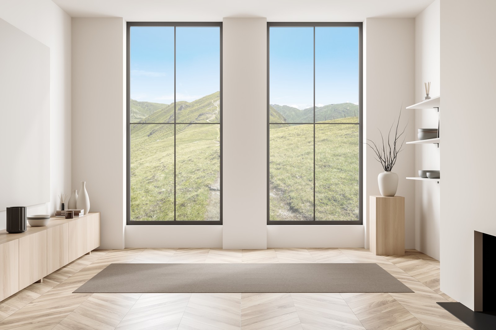 Bringen Sie Ruhe und Weite in den Raum mit diesem lebendigen Foto eines gewundenen Wanderwegs durch die Zillertal-Alpen unter klarem blauem Himmel.
