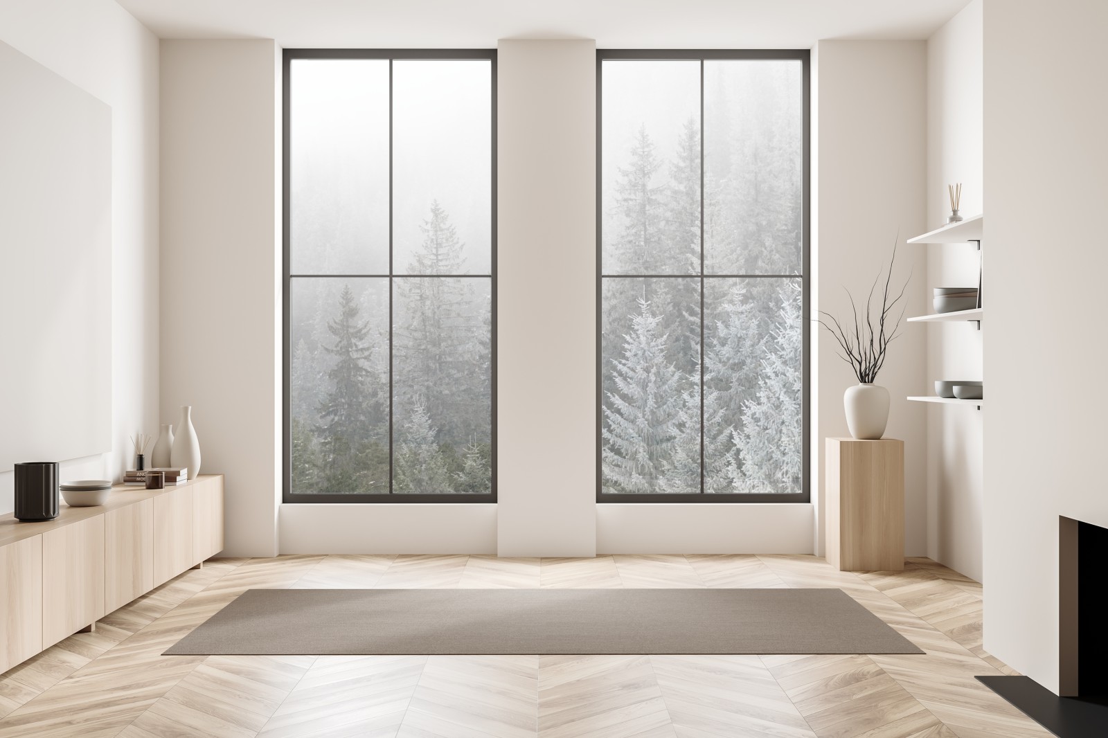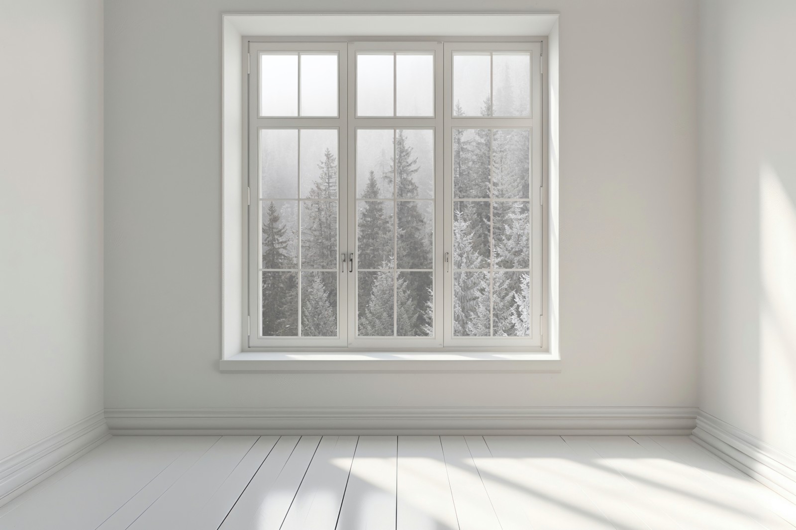 Eine ruhige, neblige Winterwaldszene aus den Karpaten bringt monochrome Schönheit und eine entspannte Atmosphäre an jede Wand.