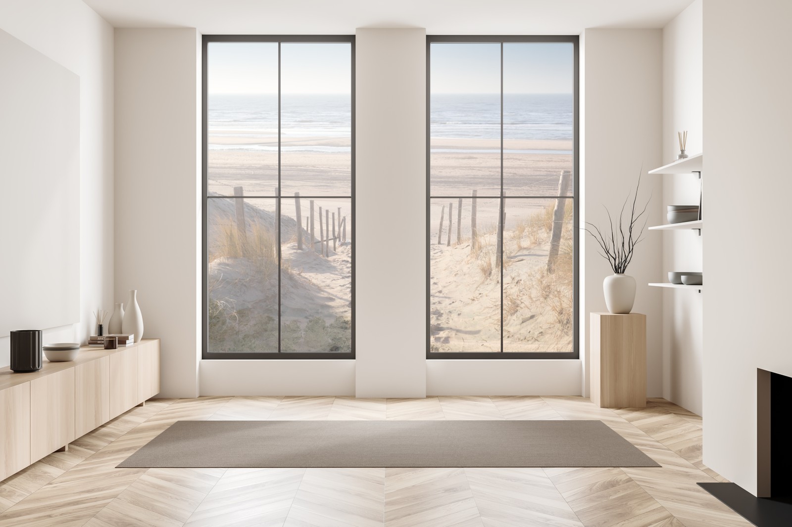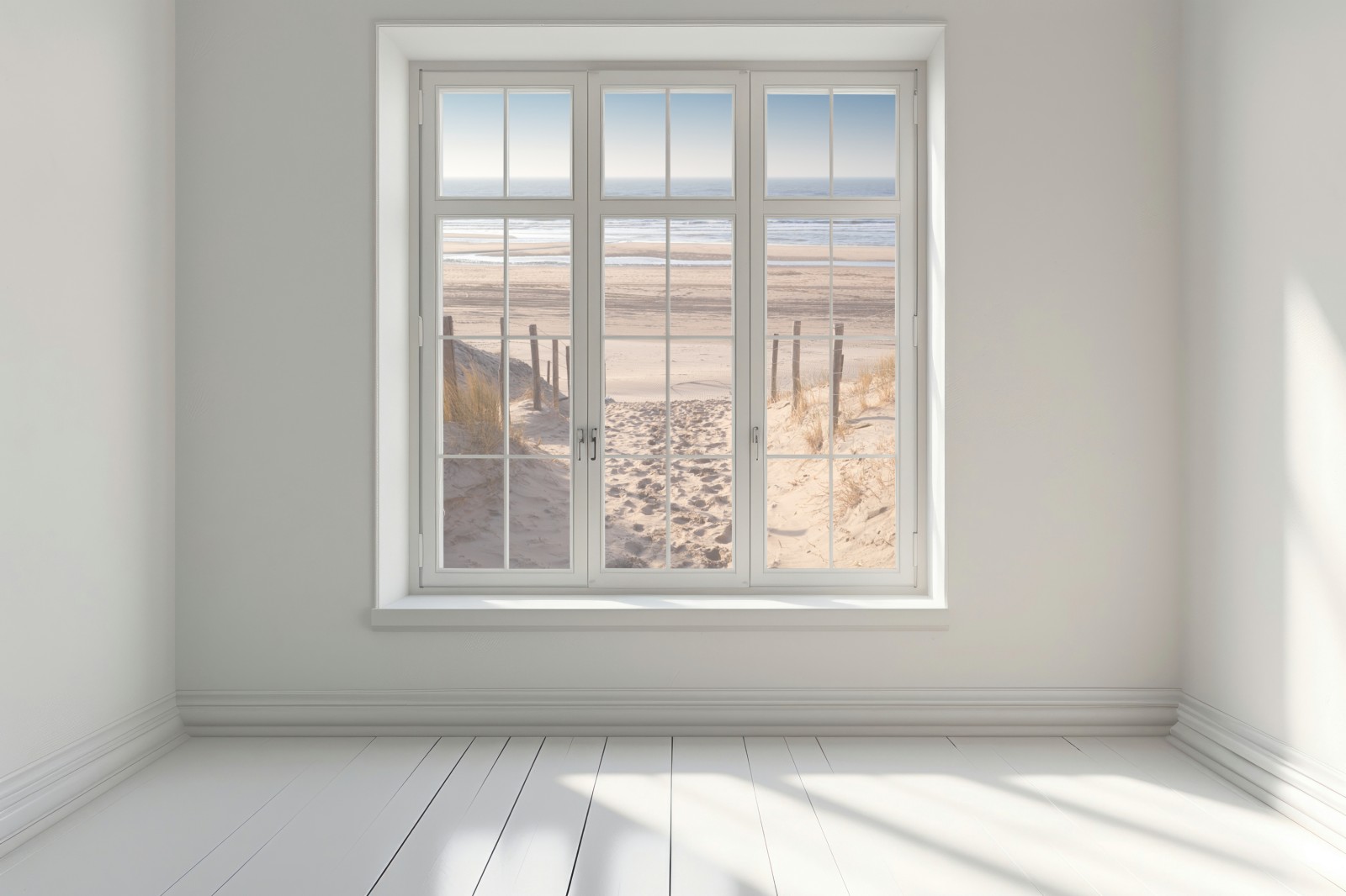 Ein ruhiger Sandweg führt durch die Dünen zur glitzernden Nordsee bei Sonnenuntergang und bringt maritimes Flair in Ihr Zuhause.
