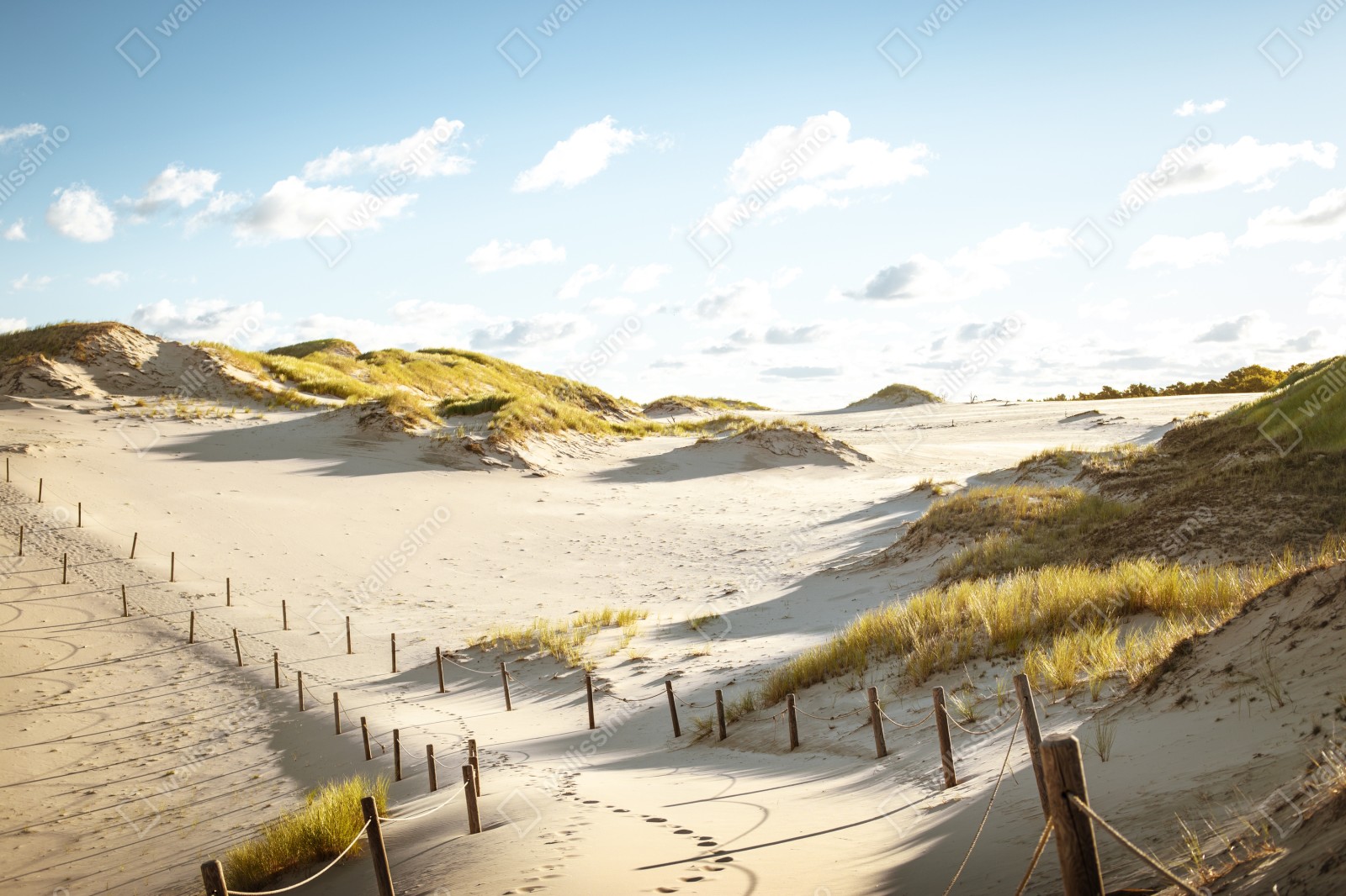 Bringen Sie ruhige Küstenstimmung in Ihr Zuhause mit dieser sonnenbeschienenen Dünenlandschaft aus dem Slowinski Nationalpark.