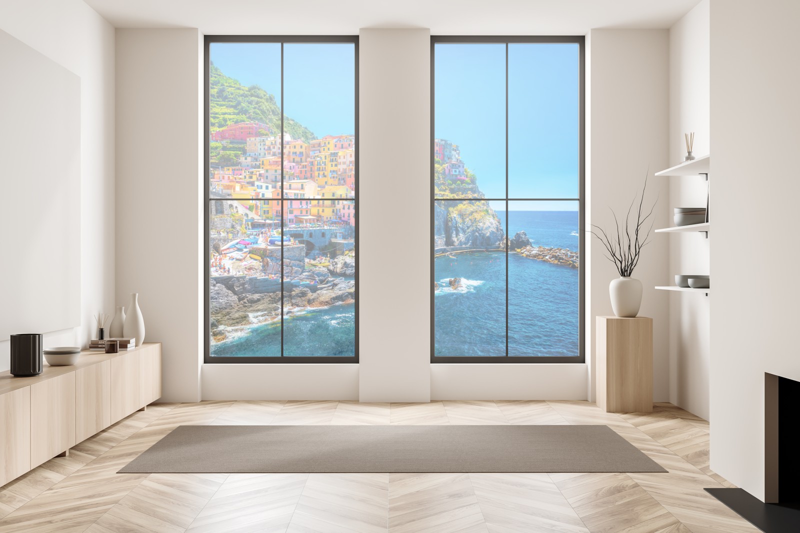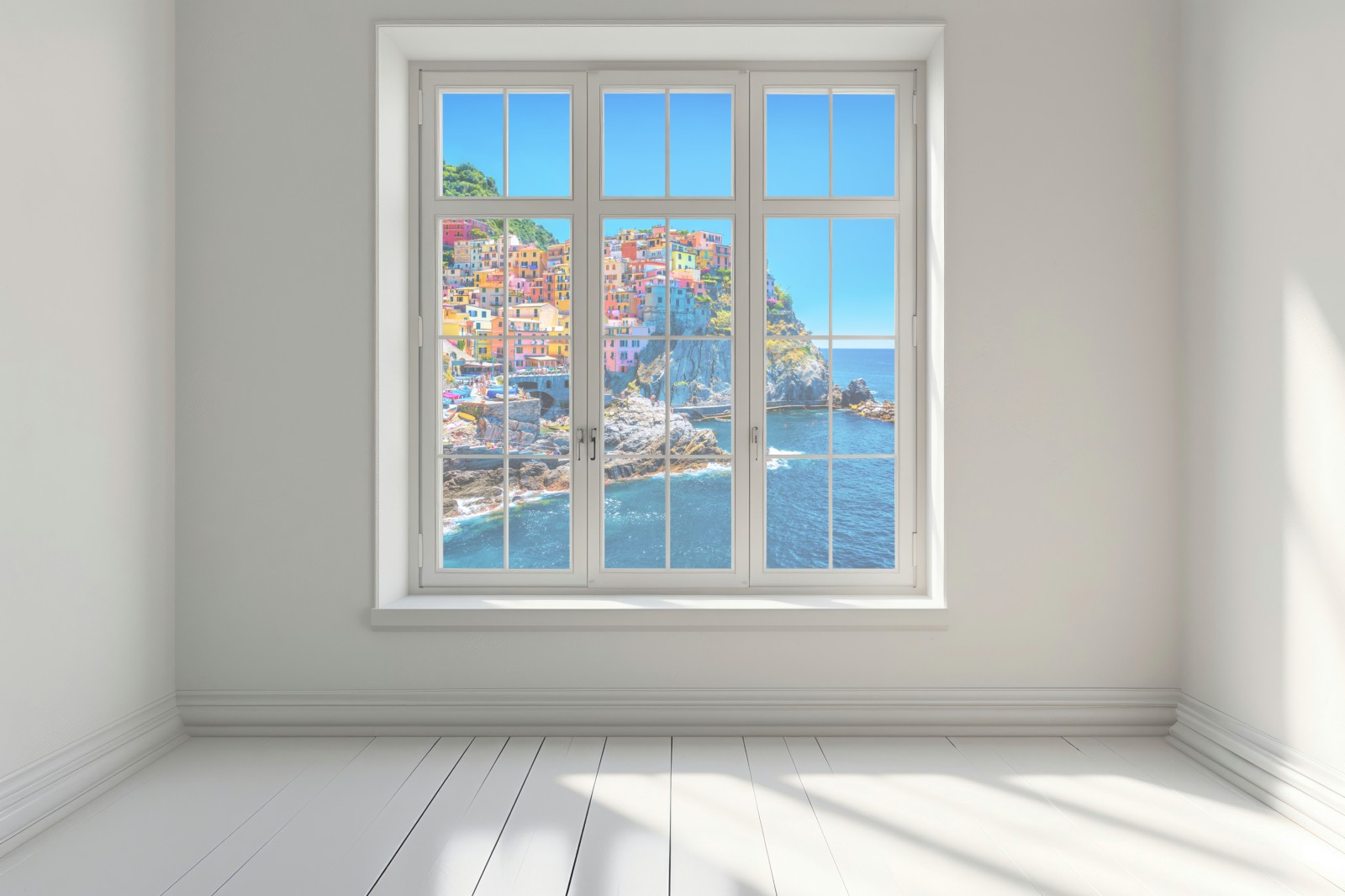 Lebendige Panoramaufnahme eines bunten Küstendorfs auf steilen Klippen, die sonnige Reiseatmosphäre und kräftige Farben in ihr Interieur bringt.