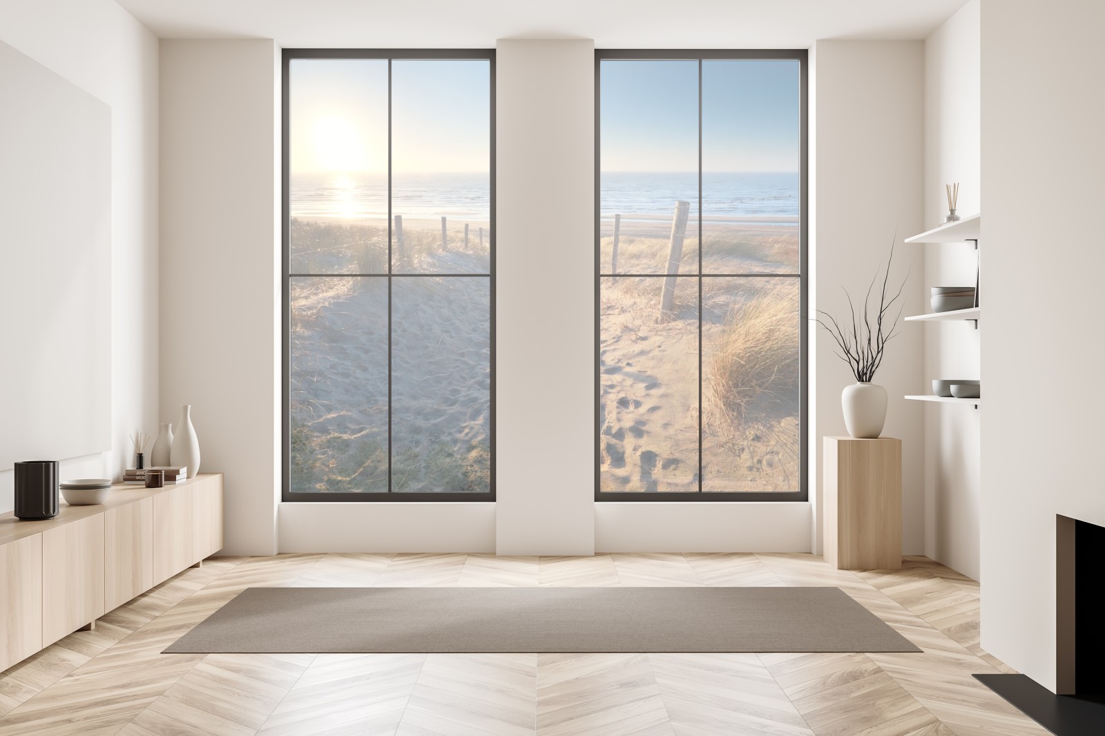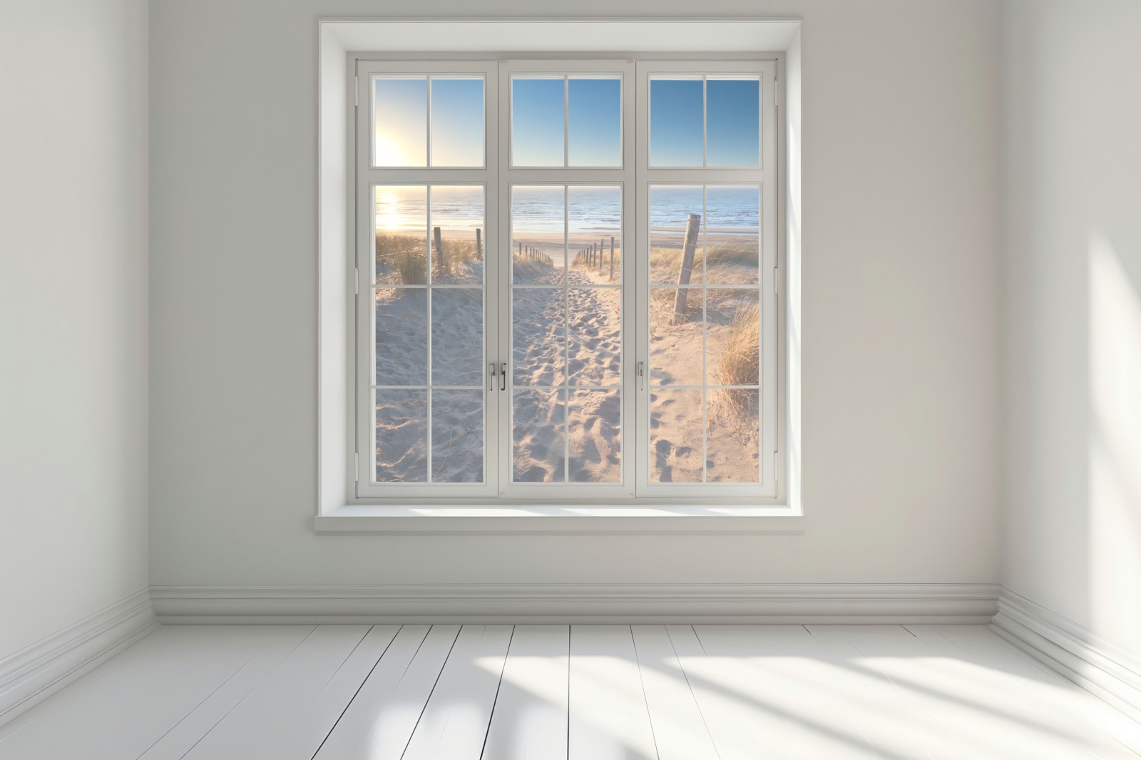 Ruhige Küstenlandschaft mit einem sandigen Pfad durch Dünen zum Nordseeufer, warmes Licht und beruhigende Farben für jede Einrichtung.