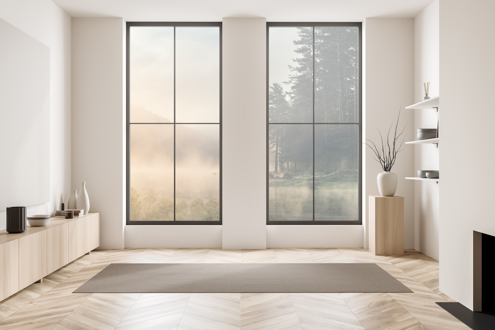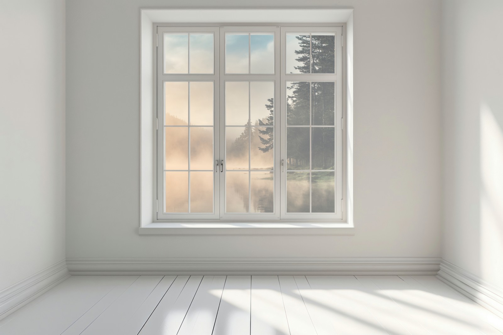 Ein ruhiger, nebliger Sonnenaufgang über einem Waldsee, ideal um eine natürliche, entspannte Atmosphäre in Ihr Zuhause zu bringen.