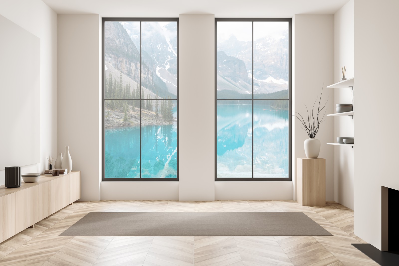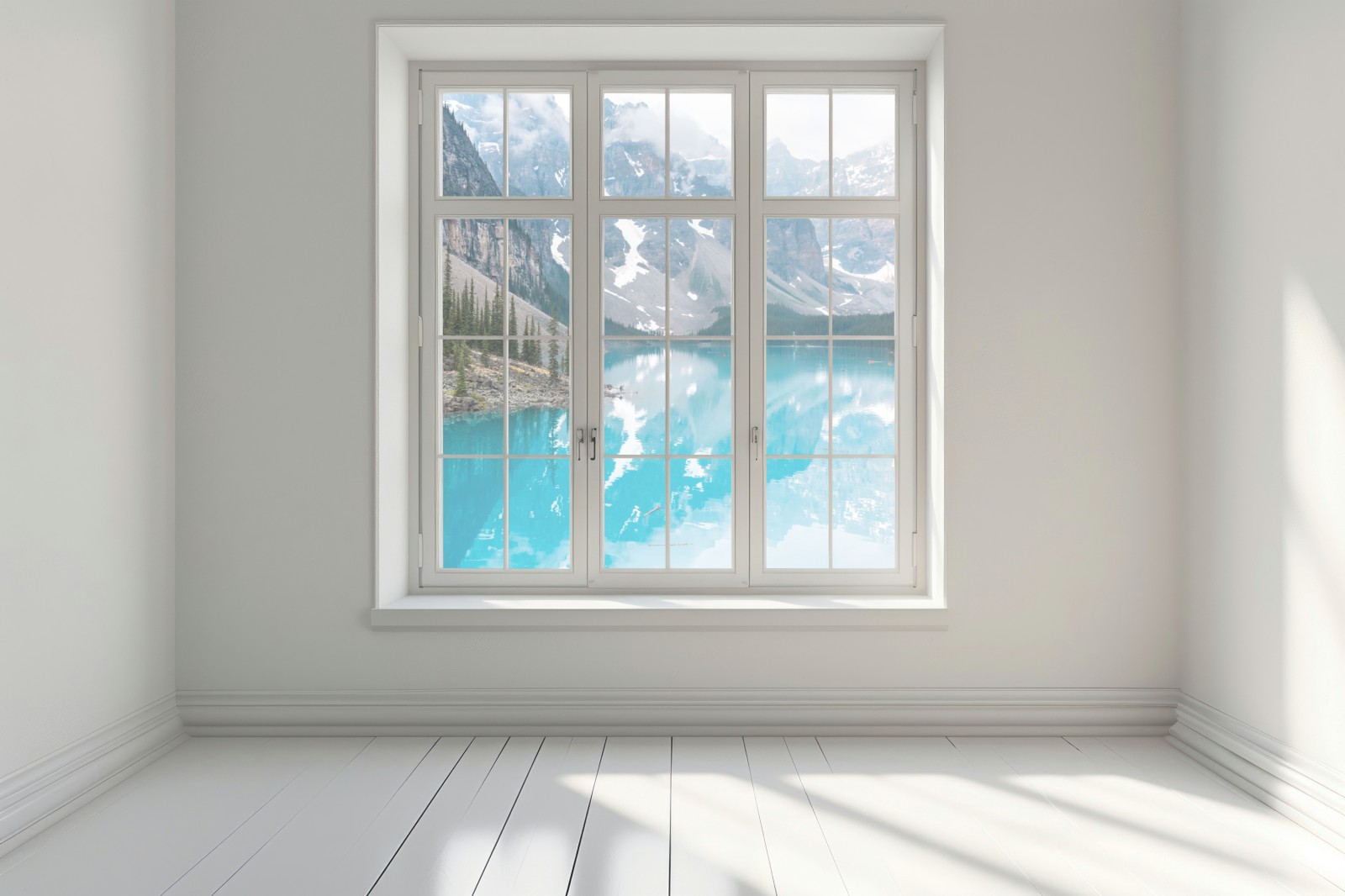 Bringen Sie alpine Ruhe in Ihr Zuhause mit diesem leuchtenden türkisen See, der majestätische Berge und immergrüne Wälder spiegelt.