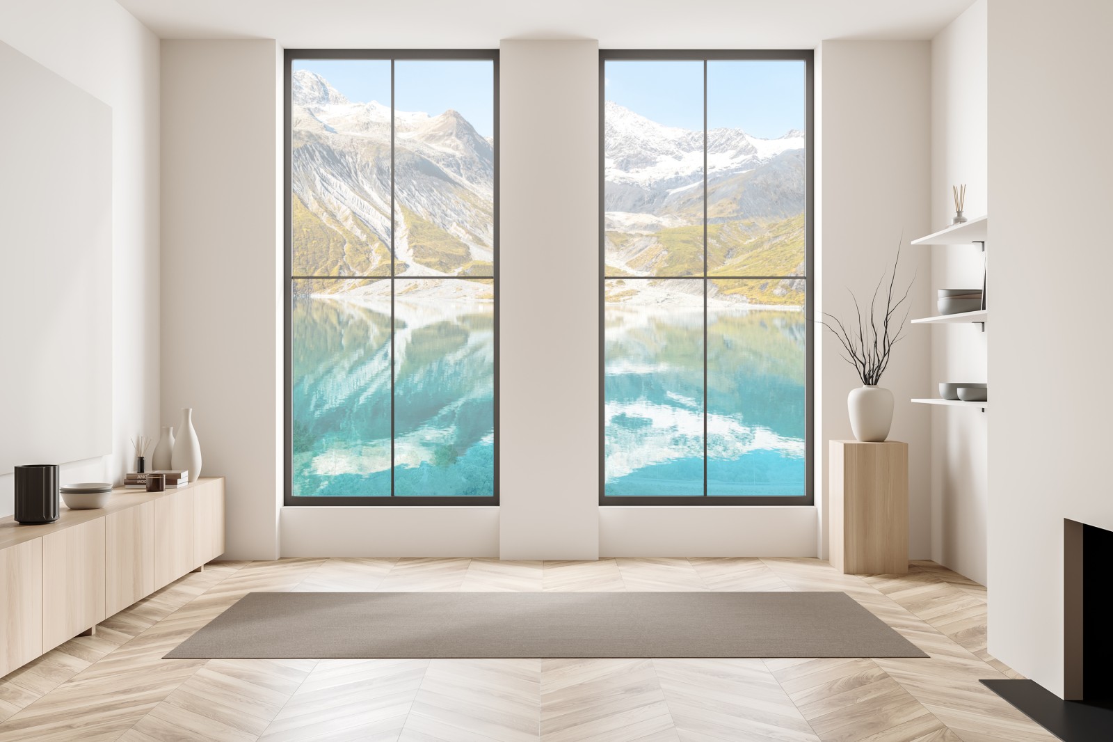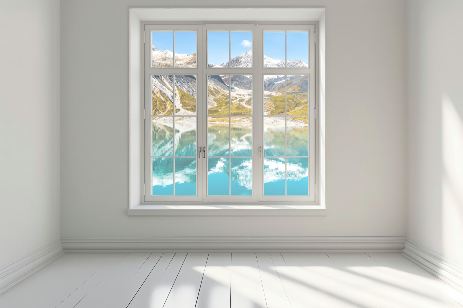Fensteraufkleber ruhiger alpensee mit schneebedeckten gipfeln