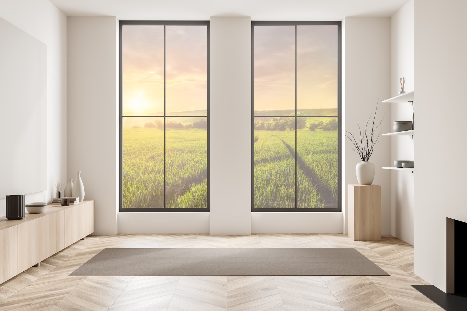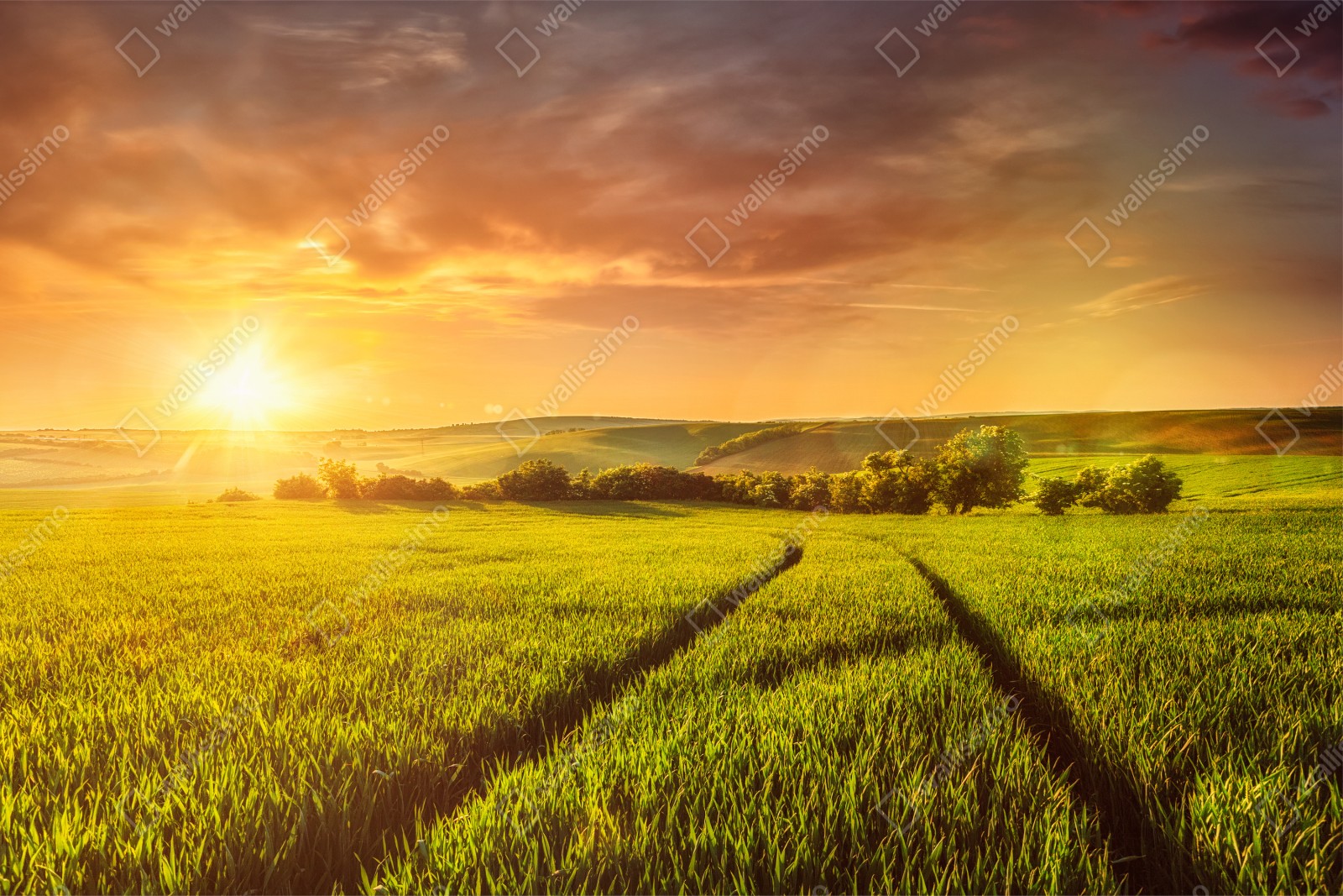 Bringen Sie Wärme und Ruhe in Ihr Zuhause mit dieser idyllischen Wiese im warmen Abendlicht.