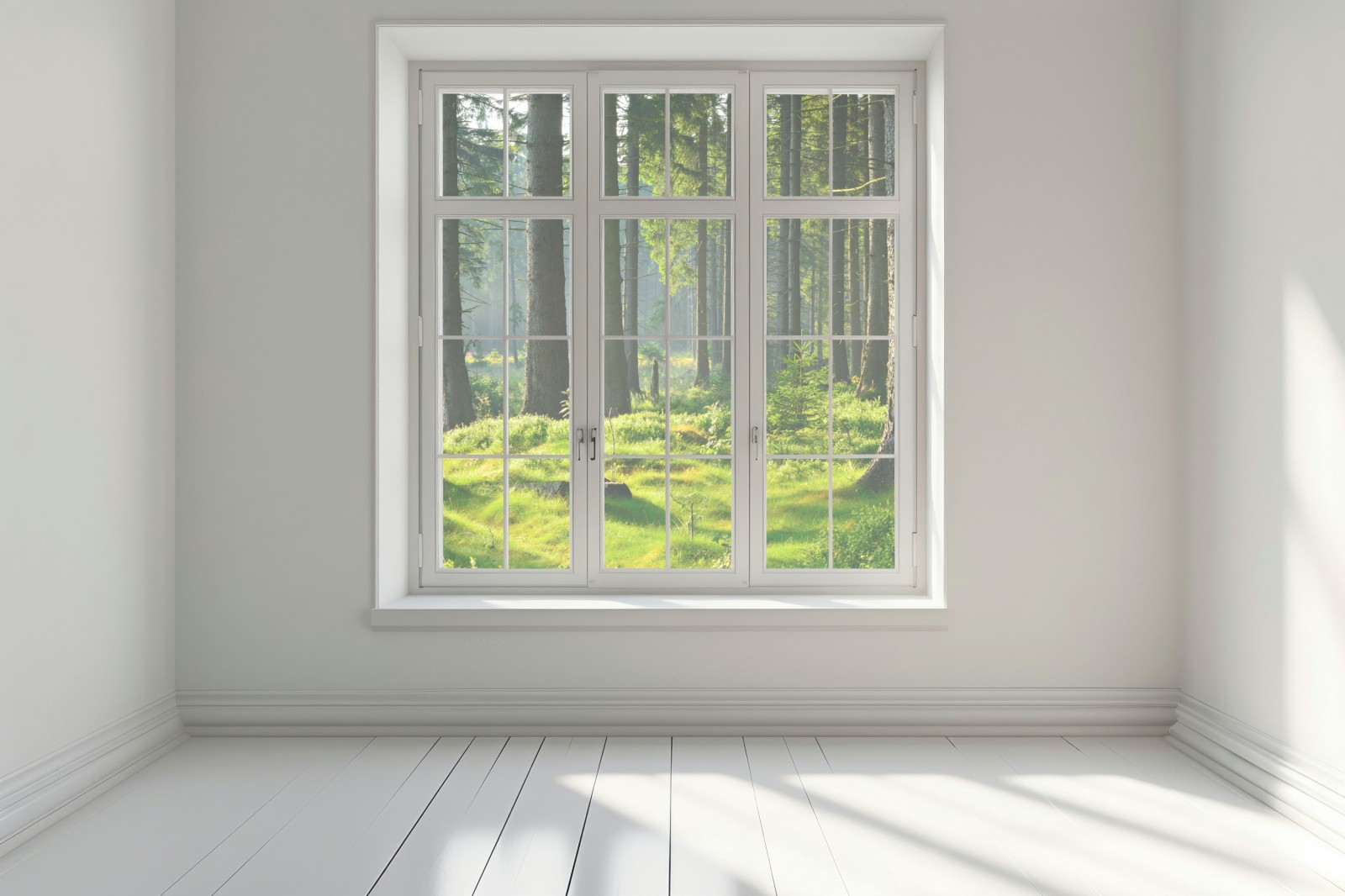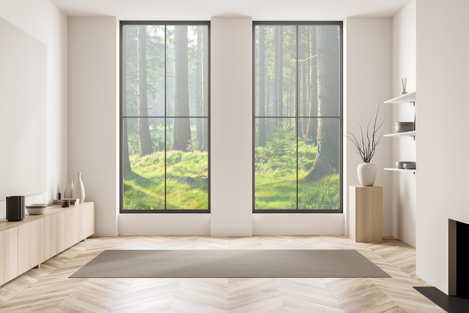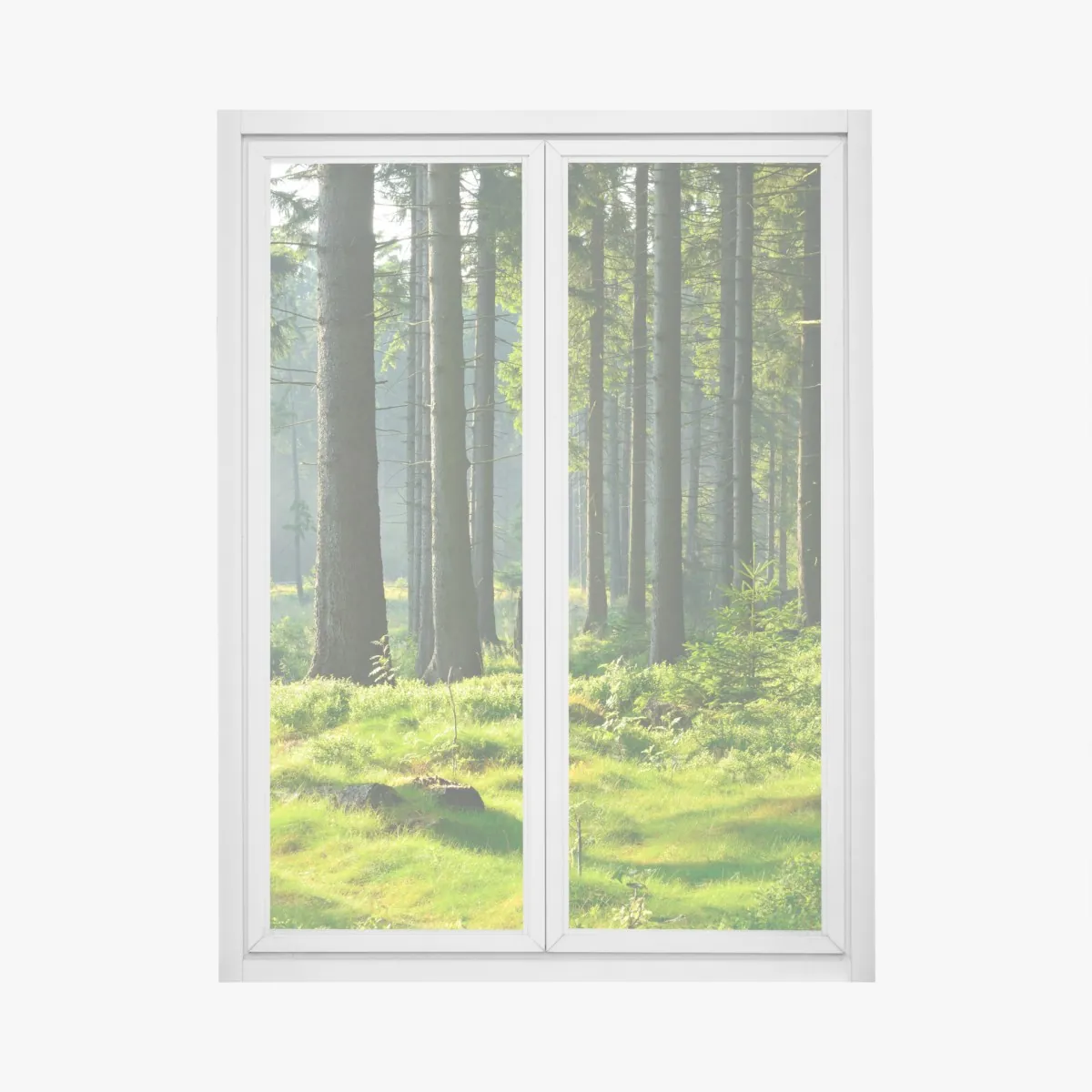 Eine ruhige, sonnendurchflutete Waldlichtung, die die Ruhe der Natur ins Zuhause bringt. Üppiges Grün, Moos und hohe Kiefern schaffen eine entspannte Atmosphäre zum Abschalten.
