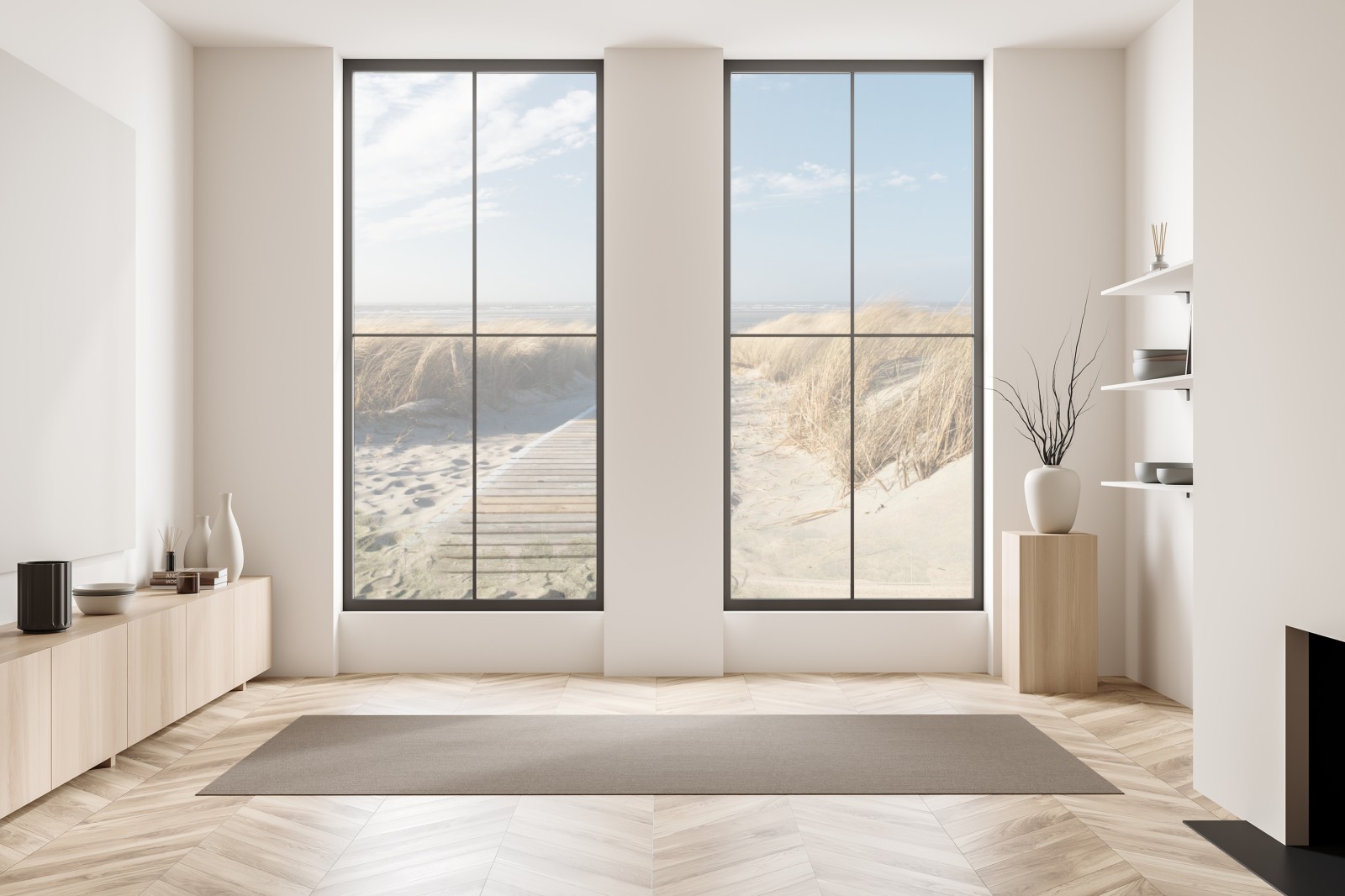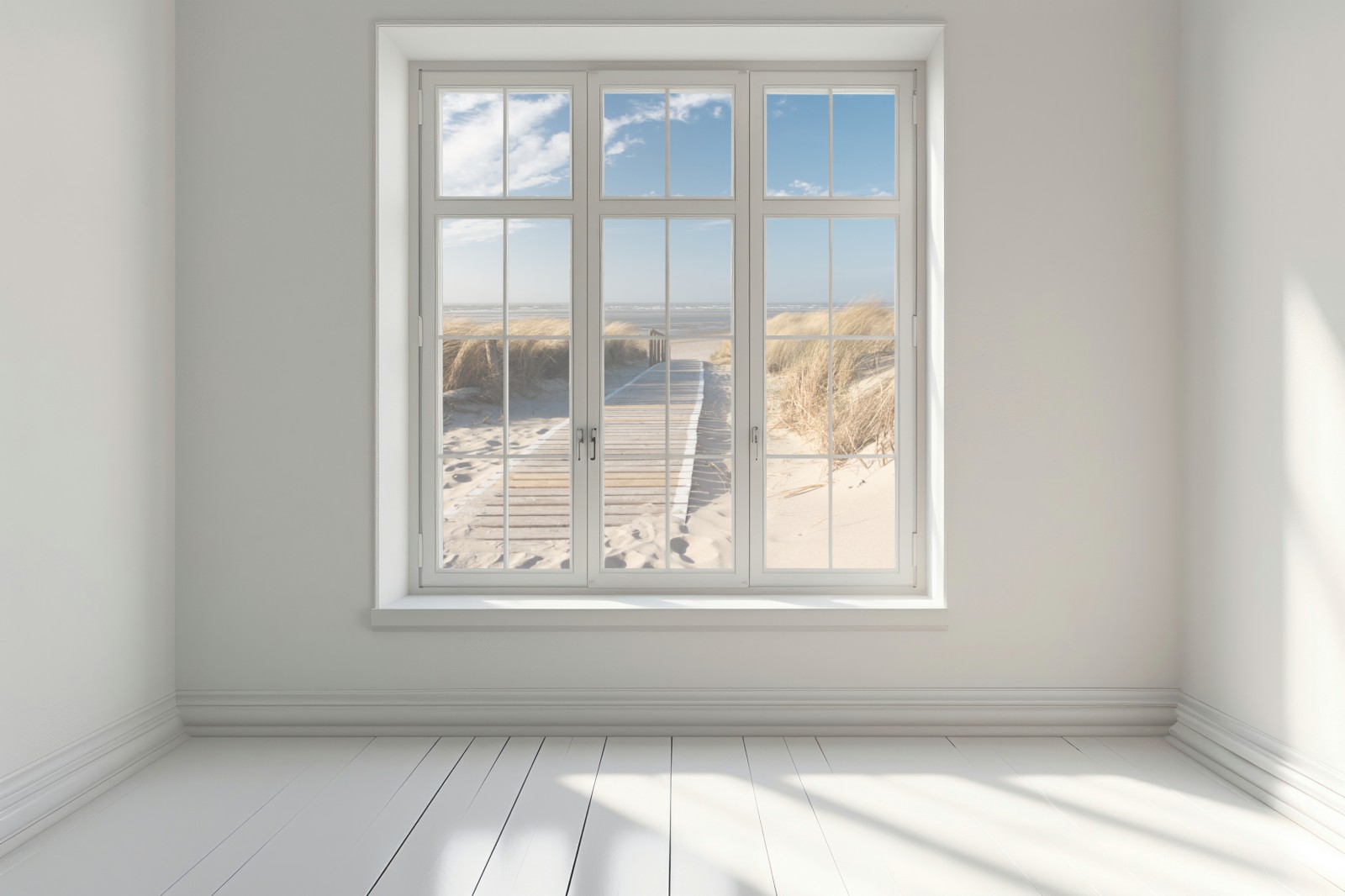 Ruhige Küstenszene mit einem hölzernen Steg durch Dünen zum Meer, ideal um ein luftiges und entspannendes Raumambiente zu schaffen.