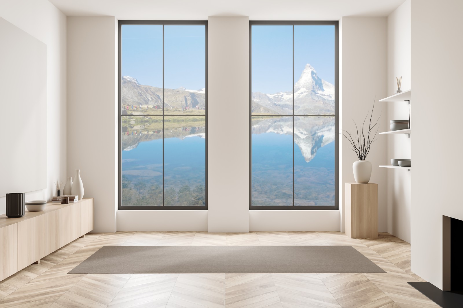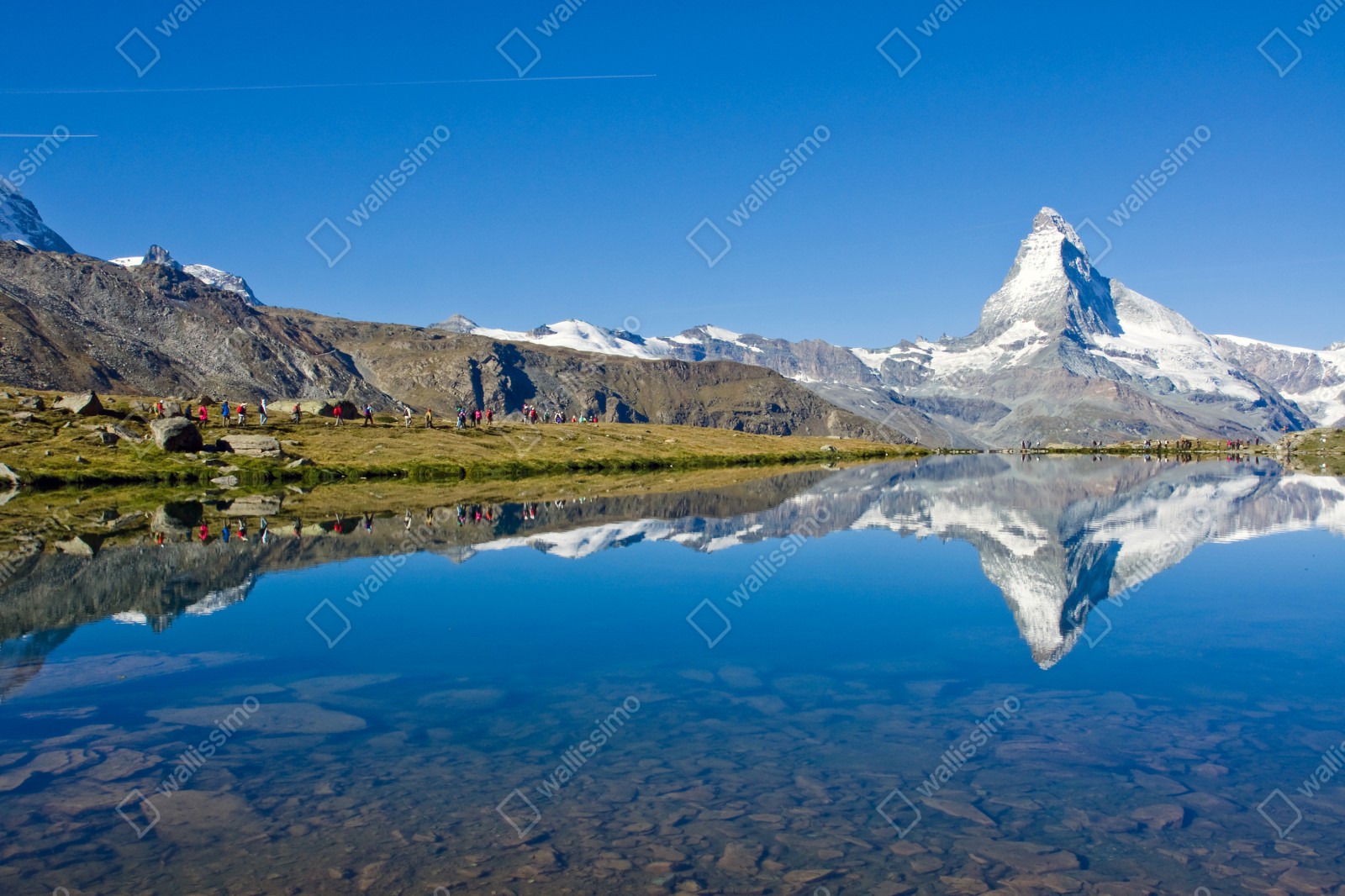 Majestätischer Alpenberg spiegelt sich in einem kristallklaren See und bringt ruhige, natürliche Atmosphäre in den Raum.
