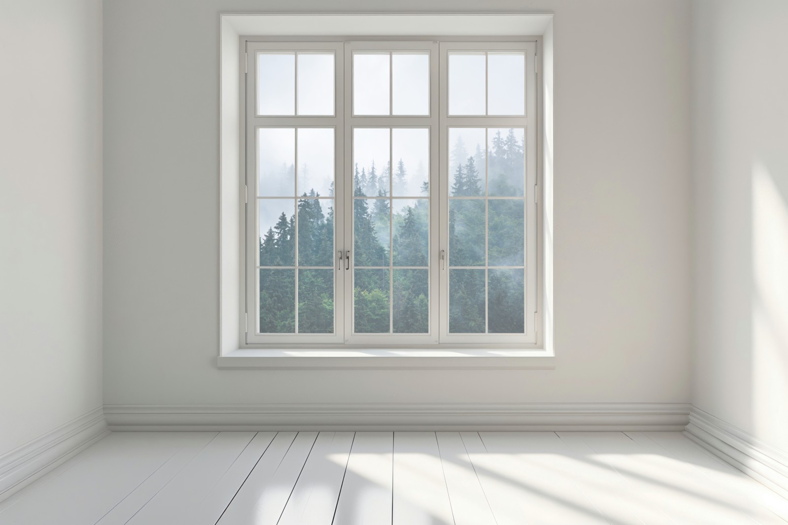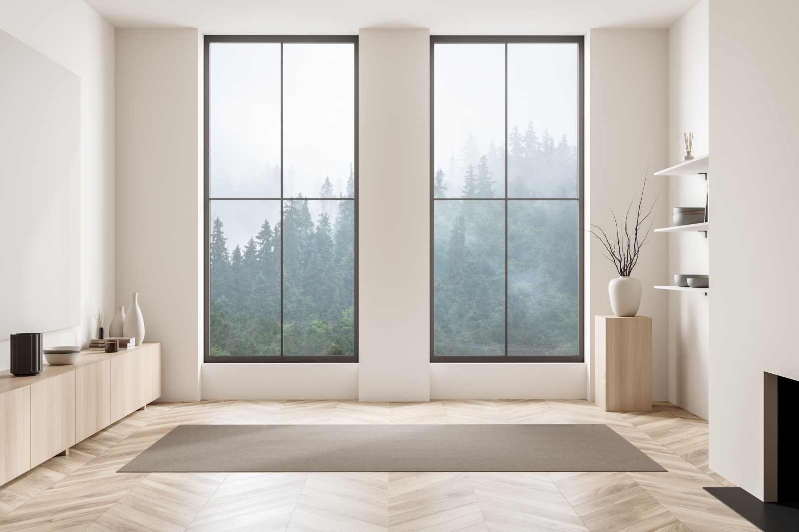 Stimmungsvolles, nebliges Waldbild, das Ruhe, natürliche Schönheit und Tiefe in jedes Interieur bringt.
