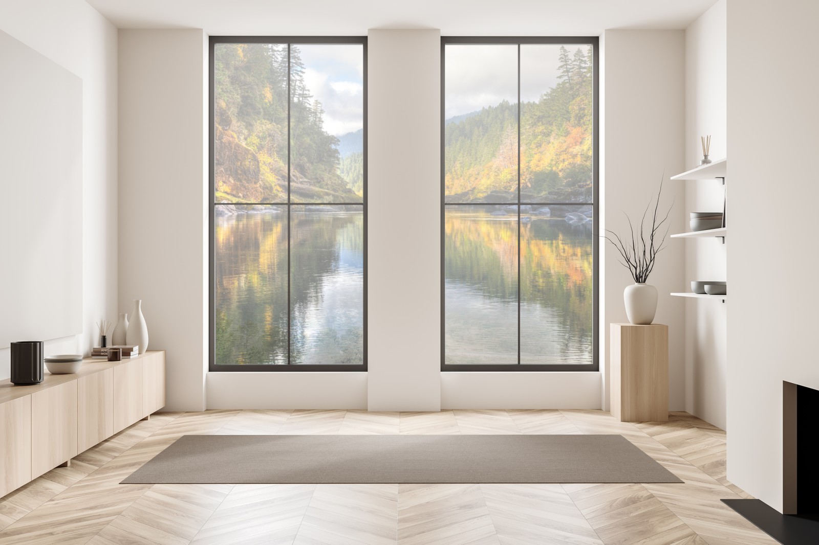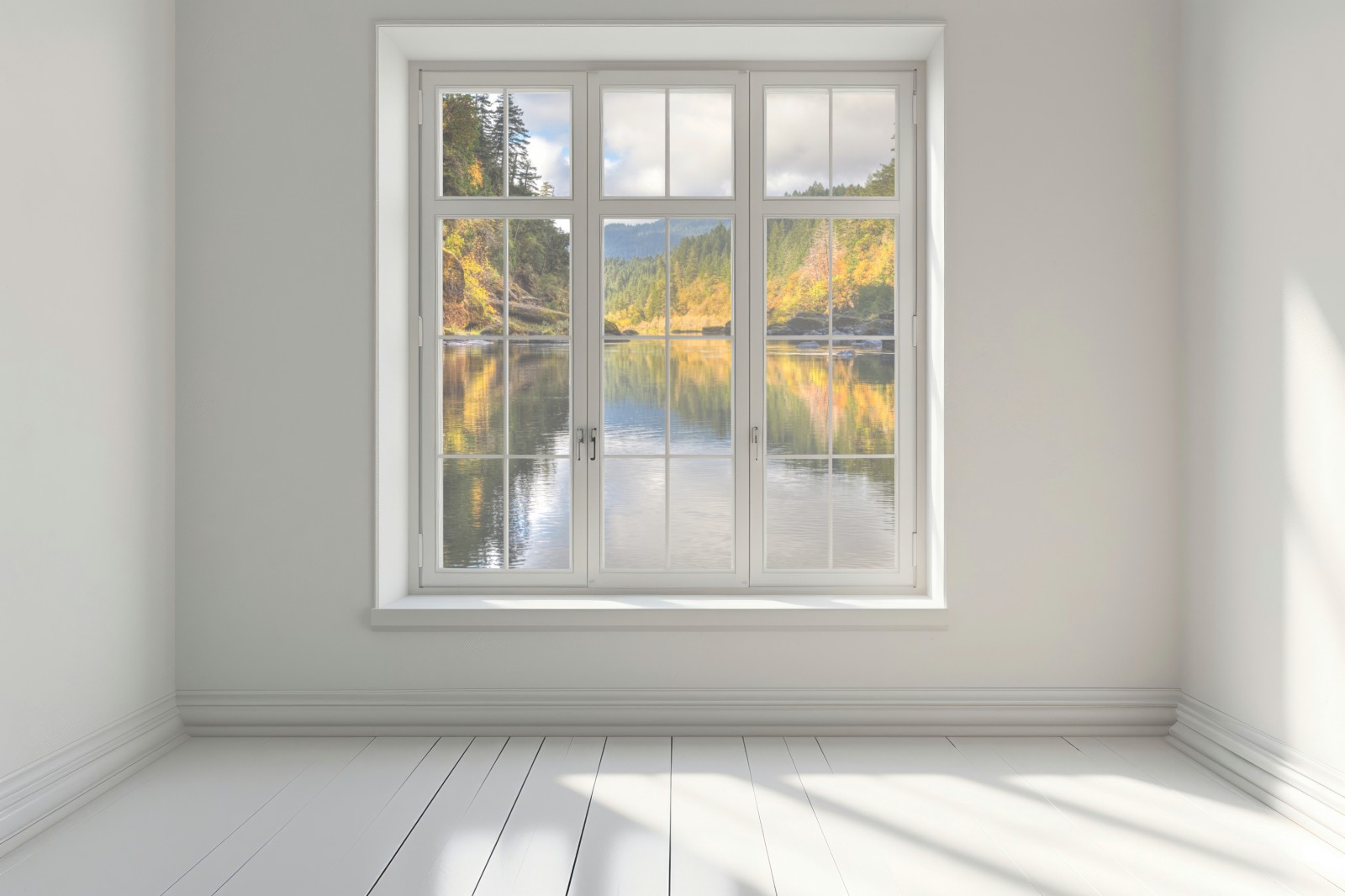 Eine ruhige herbstliche Flusslandschaft mit lebendigen Spiegelungen und sanftem Wasser, ideal um die Ruhe der Natur ins Zuhause zu holen.