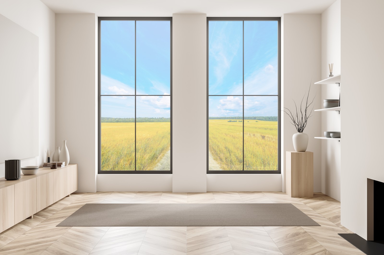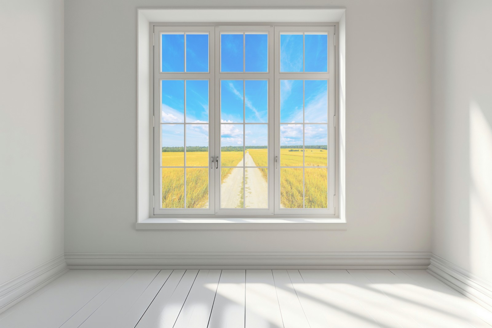 Ein ruhiger Panoramaausblick auf eine goldene Wiese mit einem geraden Feldweg zum Horizont unter klarem blauem Himmel, ideal um natürliche Ruhe in jeden Raum zu bringen.