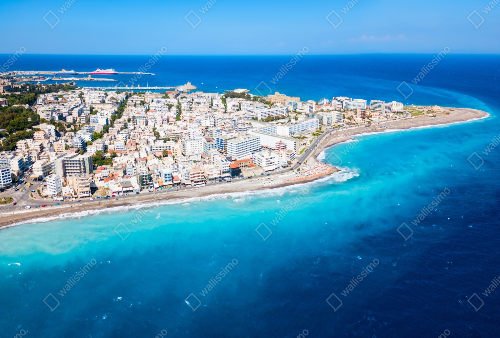 Lebendige Luftaufnahme der Küste von Rhodos mit türkisblauem Meer und sonniger Stadtansicht, ideal zur Aufwertung Ihres Wohnraums.