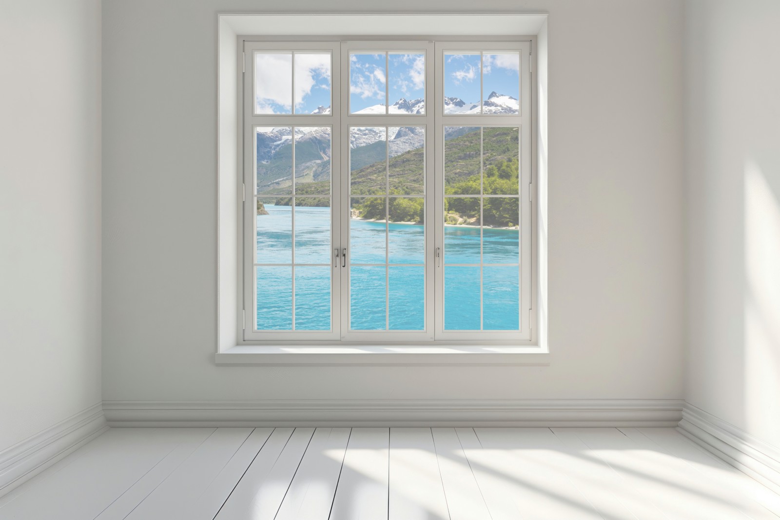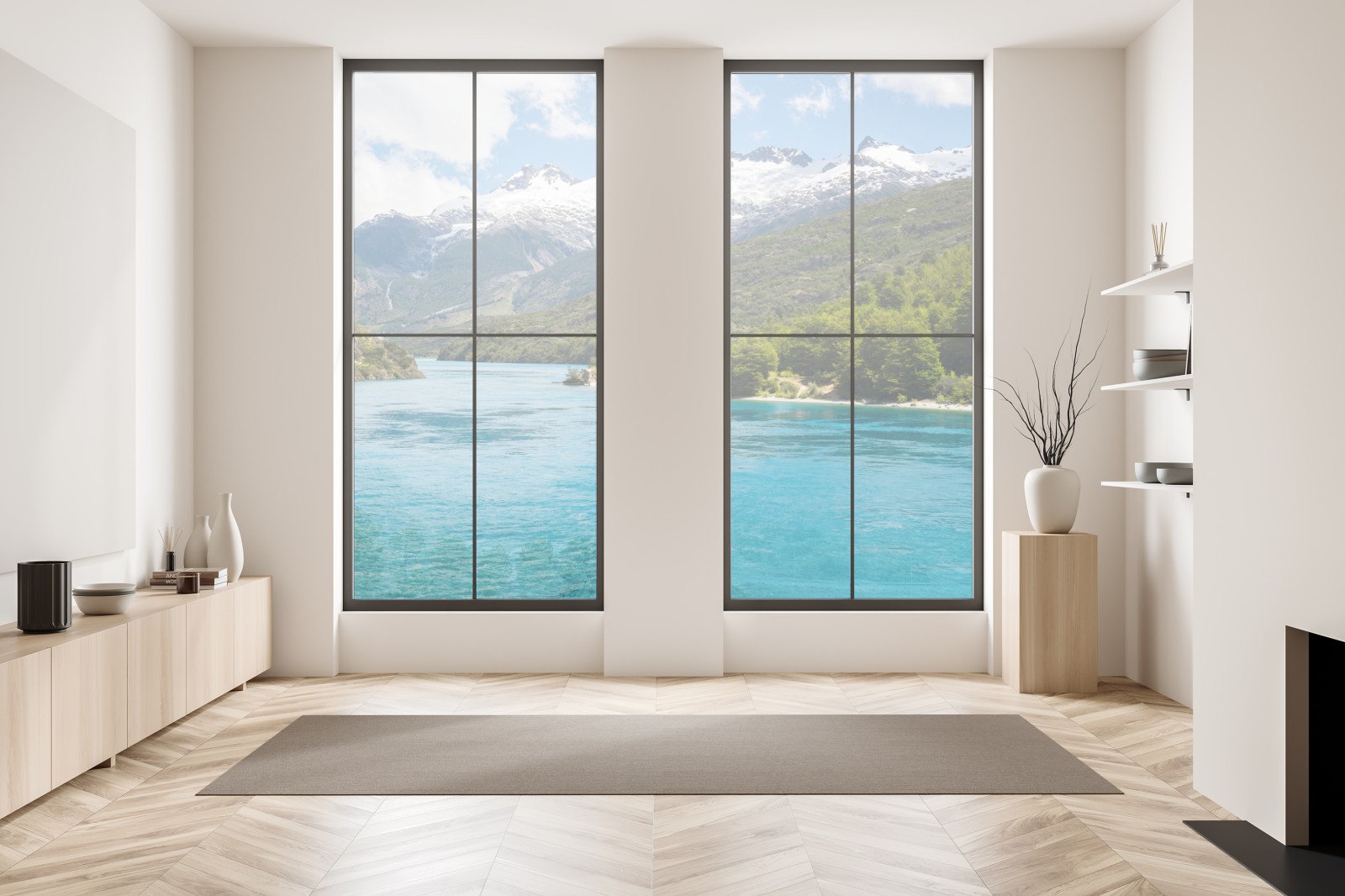 Ein ruhiger türkisfarbener See, umgeben von üppigen Wäldern und schneebedeckten Gipfeln, ideal um beruhigende Naturatmosphäre in den Raum zu bringen.