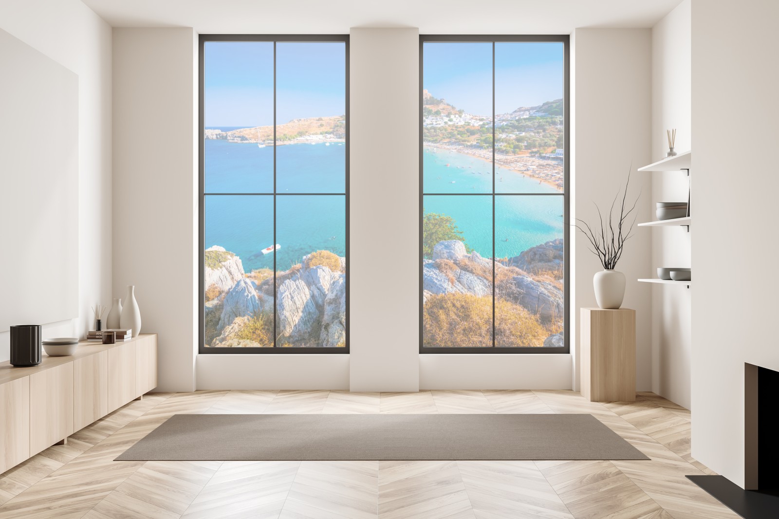 Lebendiges Meerespanorama von Lindos mit türkisfarbenem Wasser und sonnenverwöhnten Klippen, ideal um mediterrane Stimmung ins Zuhause zu bringen.