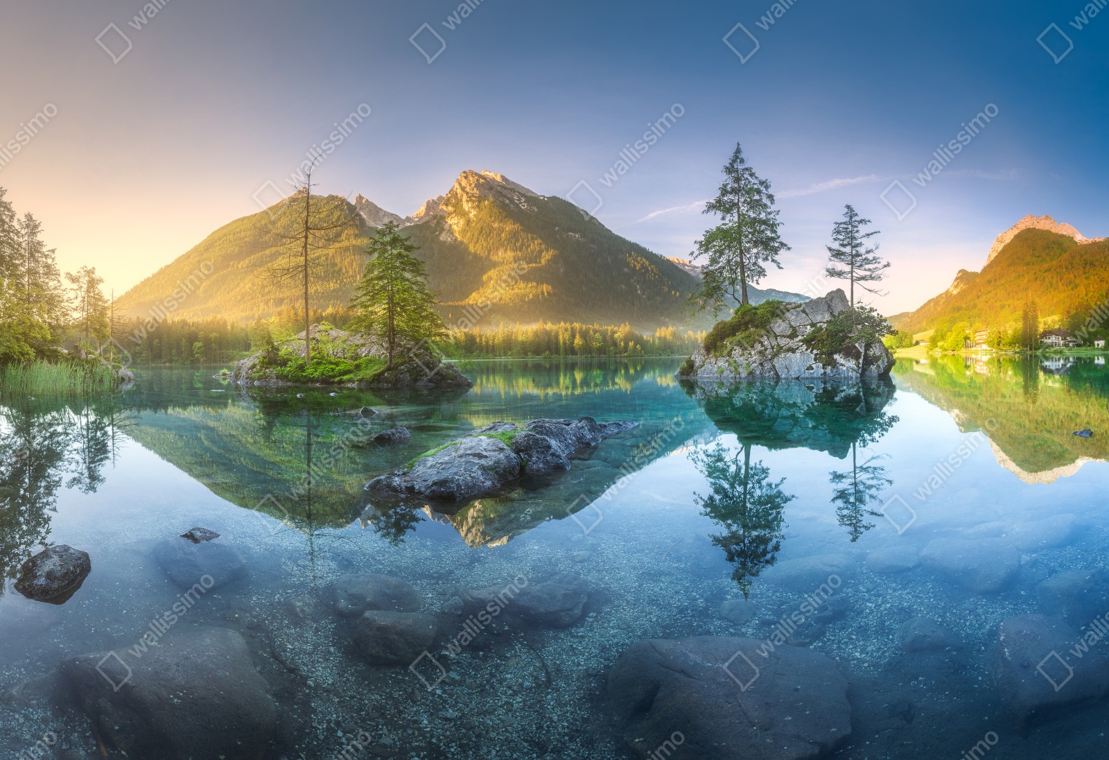 beeindruckender alpensee bei sonnenaufgang mit kristallklarem wasser und perfekter bergreflexion, bringt ruhe und natürliche schönheit in jeden raum.