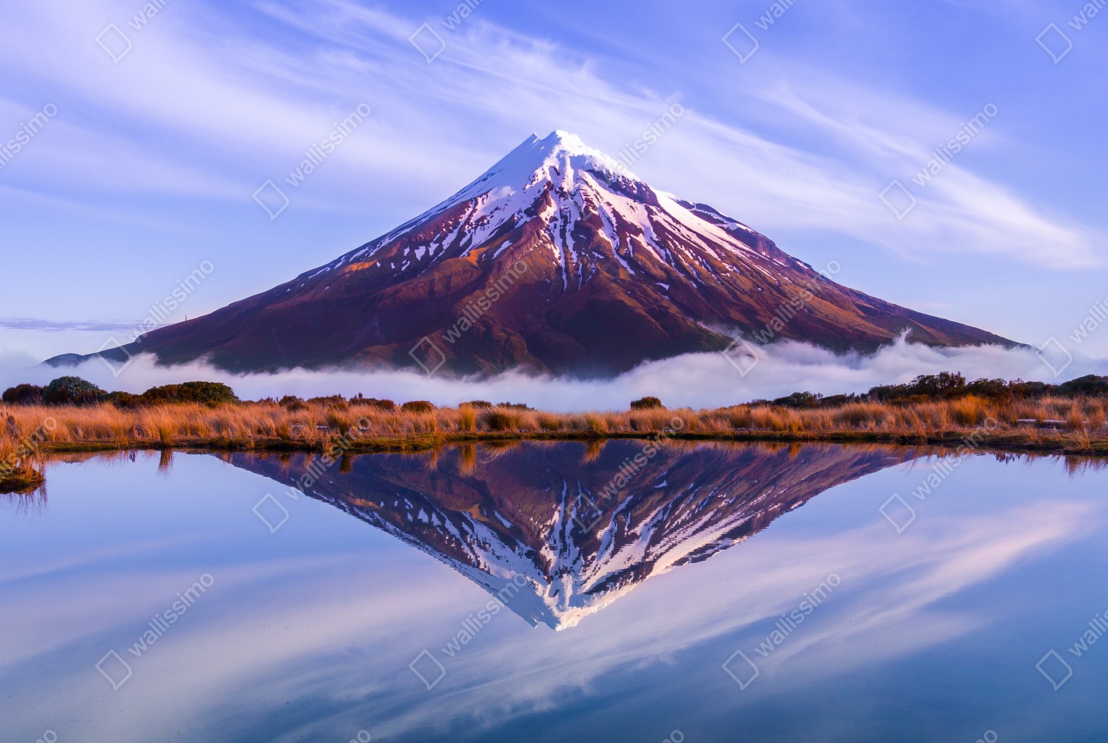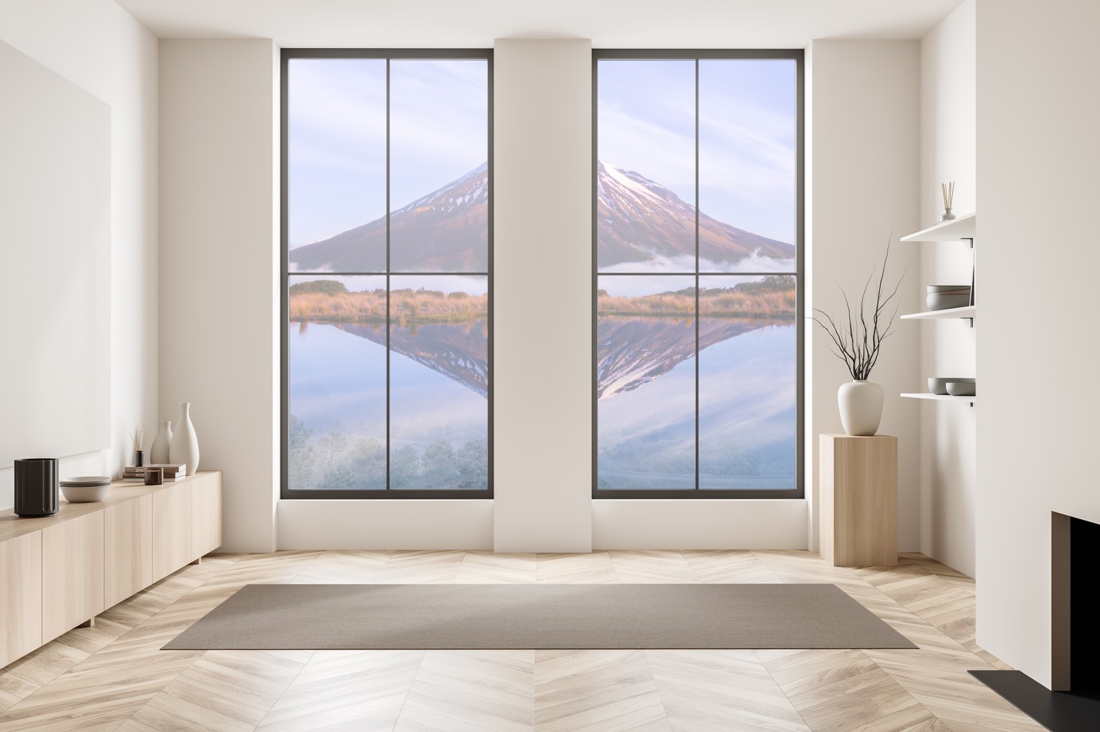Bringen Sie ruhige Alpenstimmung in Ihr Zuhause mit dieser hochauflösenden Berglandschaft, die sich in ruhigem Wasser spiegelt, ideal als natürlicher, entspannender Blickfang für jeden Raum.