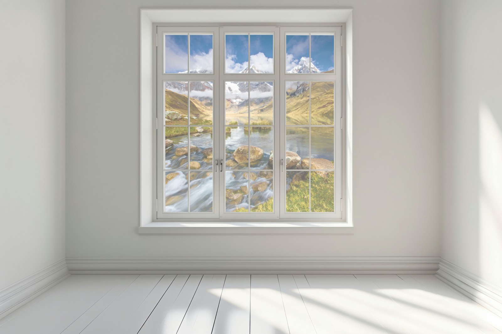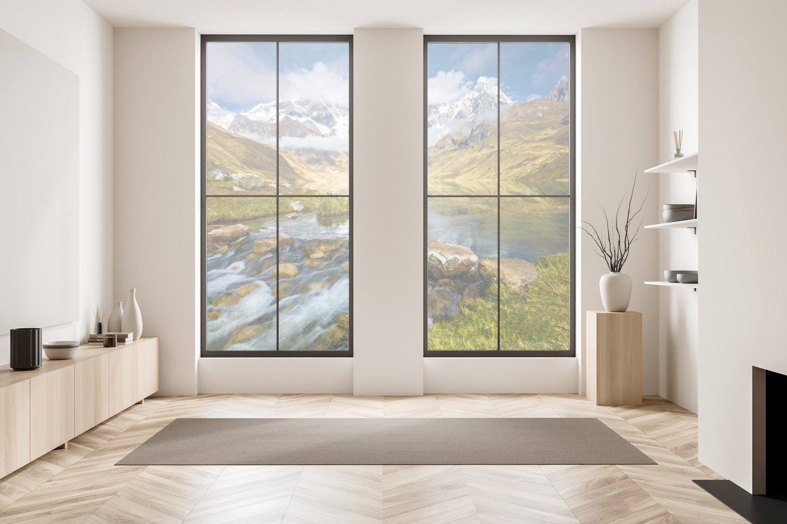 Bringen Sie Ruhe in Ihr Zuhause mit einer beeindruckenden Alpenseen-Panoramaaufnahme mit schneebedeckten Gipfeln, spiegelnder Wasseroberfläche und grünen Wiesen.