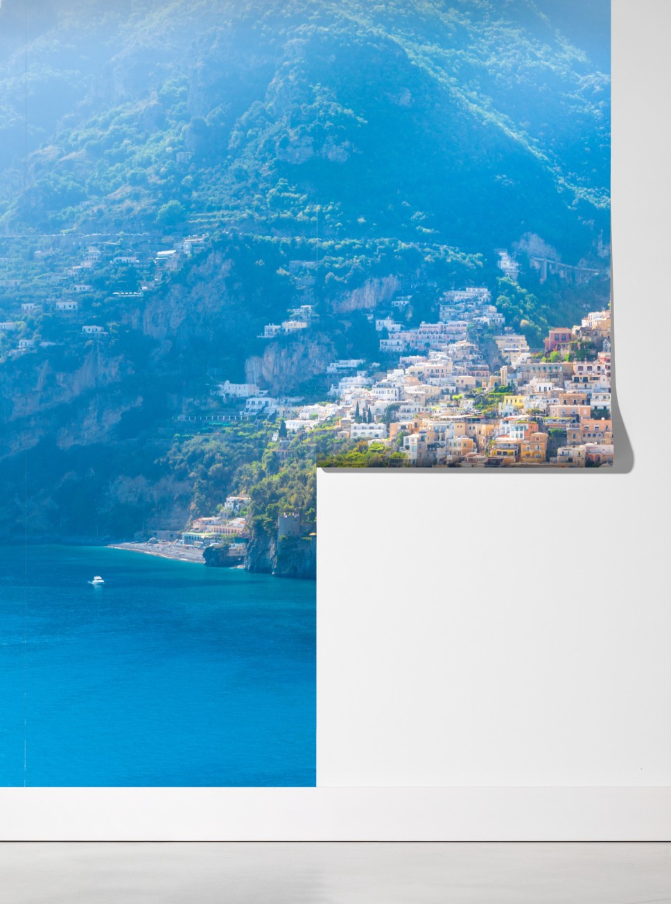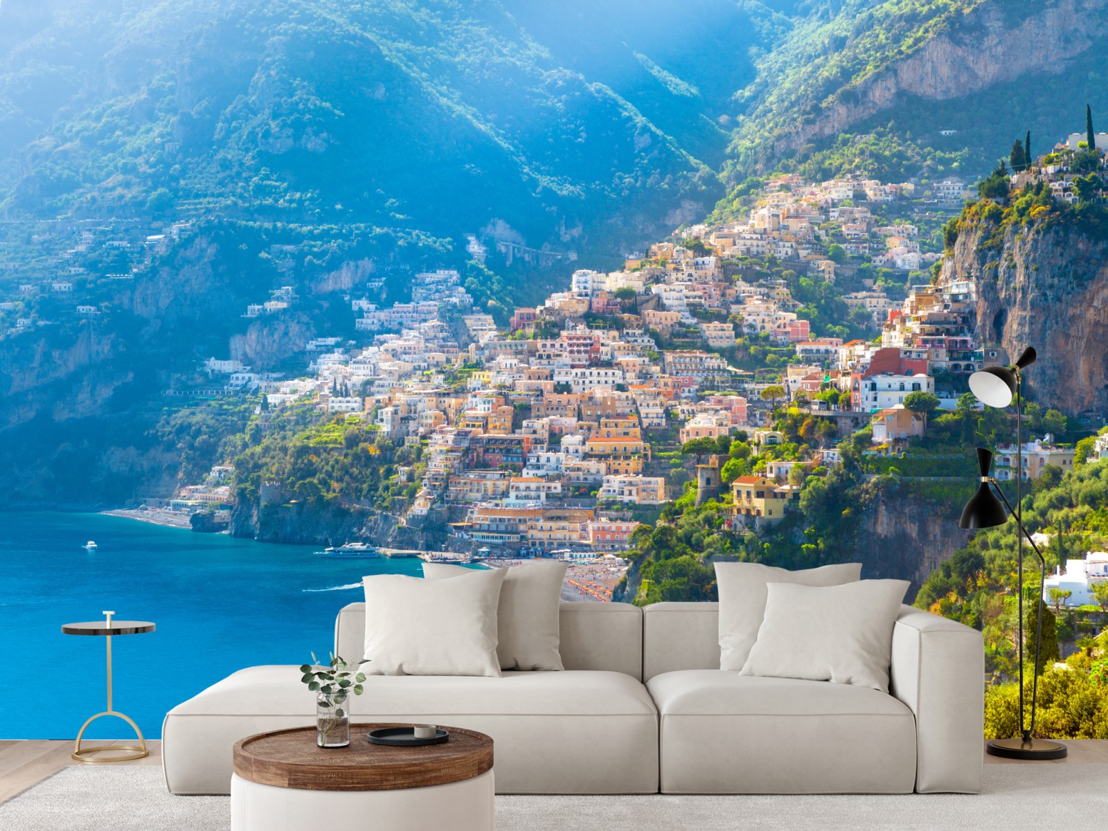 Lebhafte Küstenaufnahme von Positano mit pastellfarbenen Häusern, türkisfarbenem Meer und dramatischen Klippen, die mediterranes Flair in Ihr Zuhause bringt.