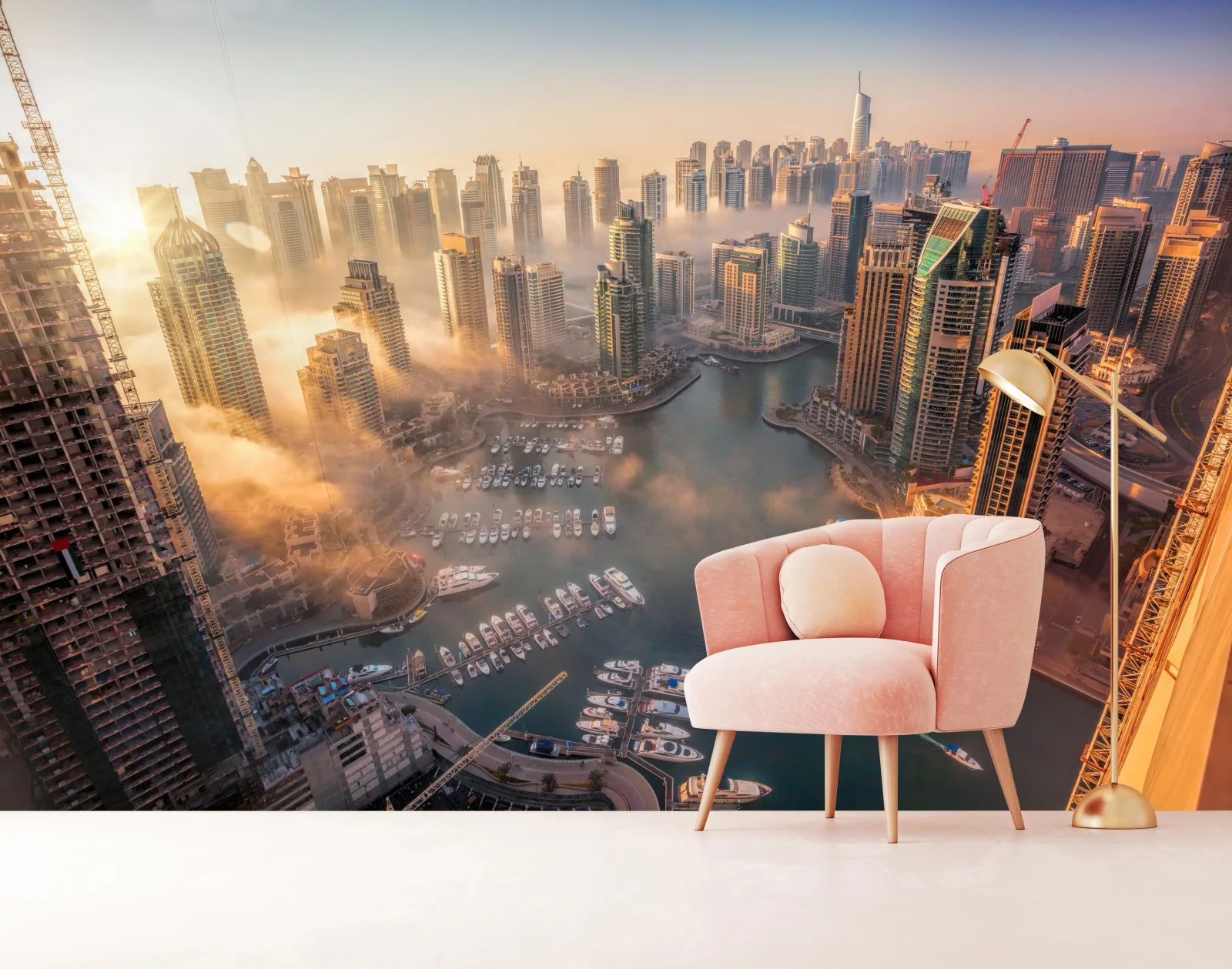 Atemberaubende Luftaufnahme der Dubai Marina bei Sonnenuntergang mit goldenem Licht, ideal für moderne Innenräume.MehrWeniger