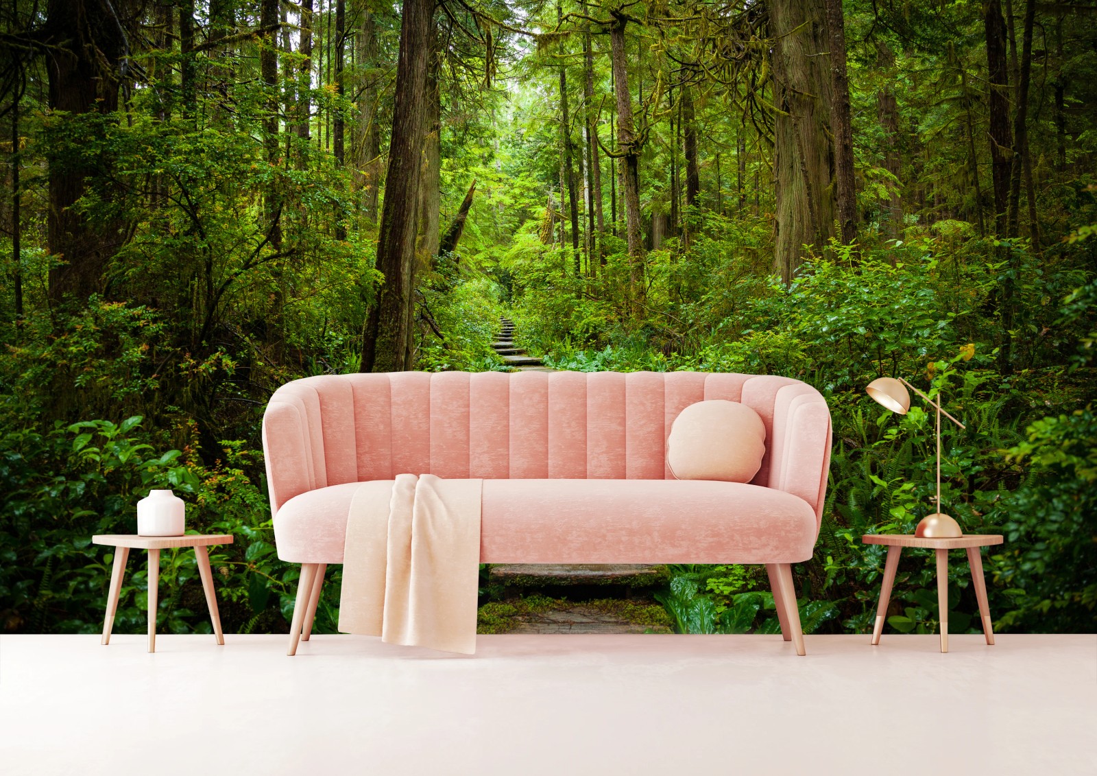 ein ruhiger waldsteg zwischen dichtem grün und farnen, perfekt um natürliche ruhe in ihr zuhause zu bringen.MehrWeniger