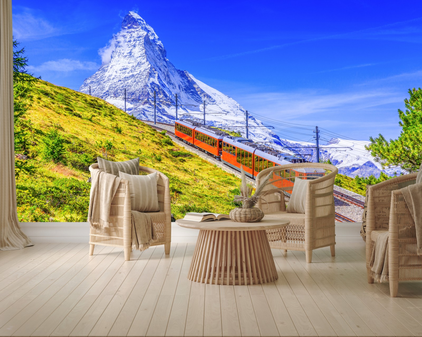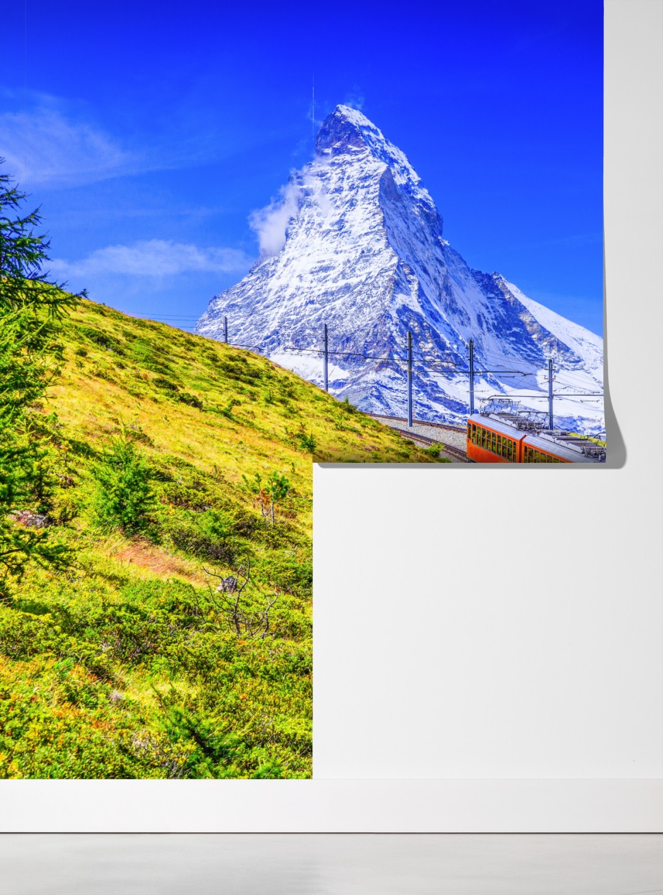 Lebendige Alpenaufnahme mit einem orangefarbenen Bergzug, der zum Matterhorn fährt, perfekt, um Reiseflair und kräftige Farben an Ihre Wand zu bringen.