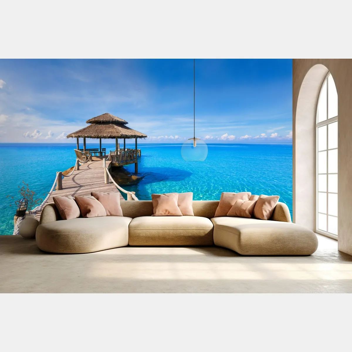 Bringen Sie tropische Gelassenheit in Ihr Zuhause mit einem sonnenbeschienenen Holzsteg über kristallklarem türkisfarbenem Wasser, ideal für eine ruhige und luftige Atmosphäre.